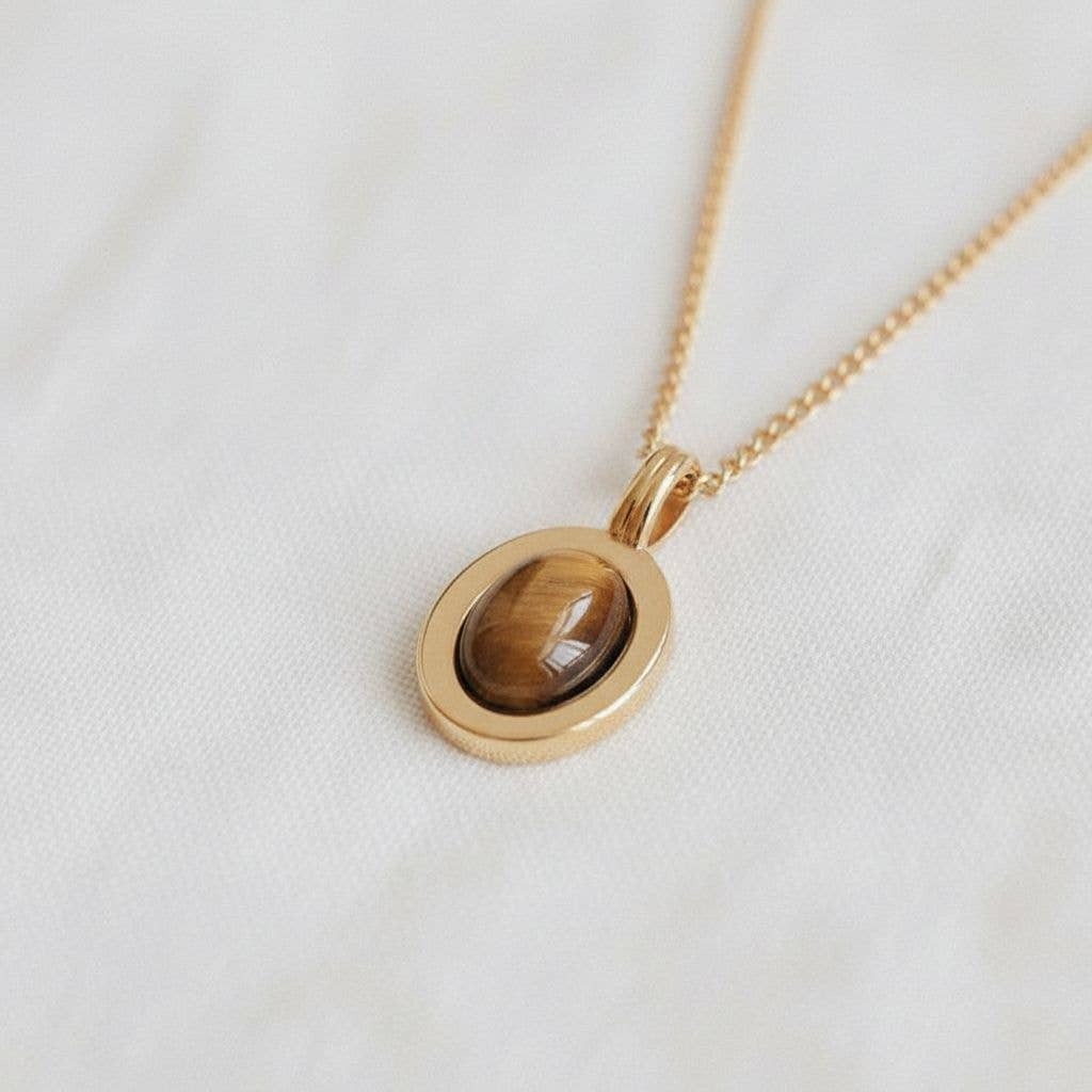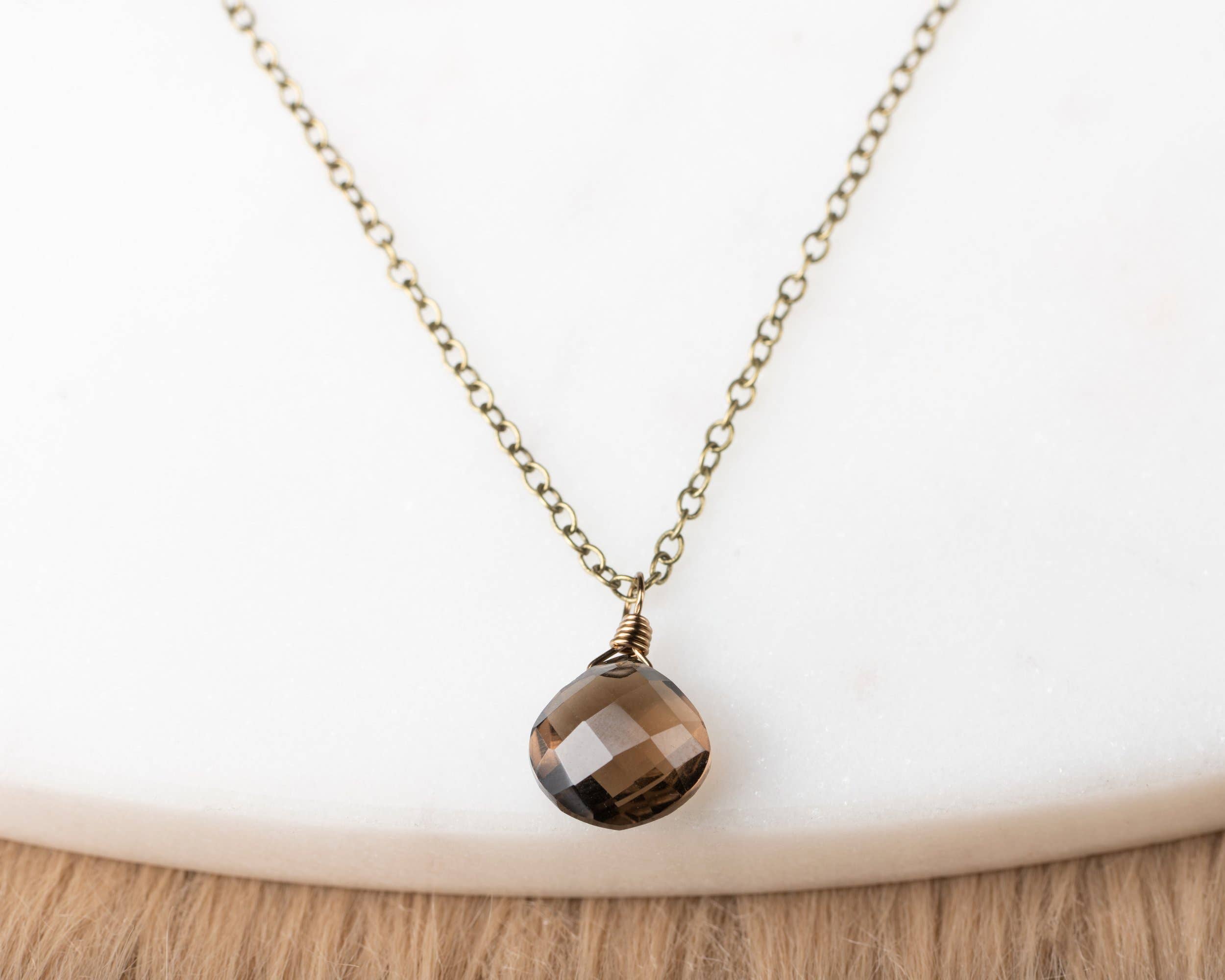 I wire wrapped tiny faceted black glass together to a chain and then wire wrapped a Tiger's Eye briolette as a pendant. Choose from silver or gold plated chain. Chain is 18" long.