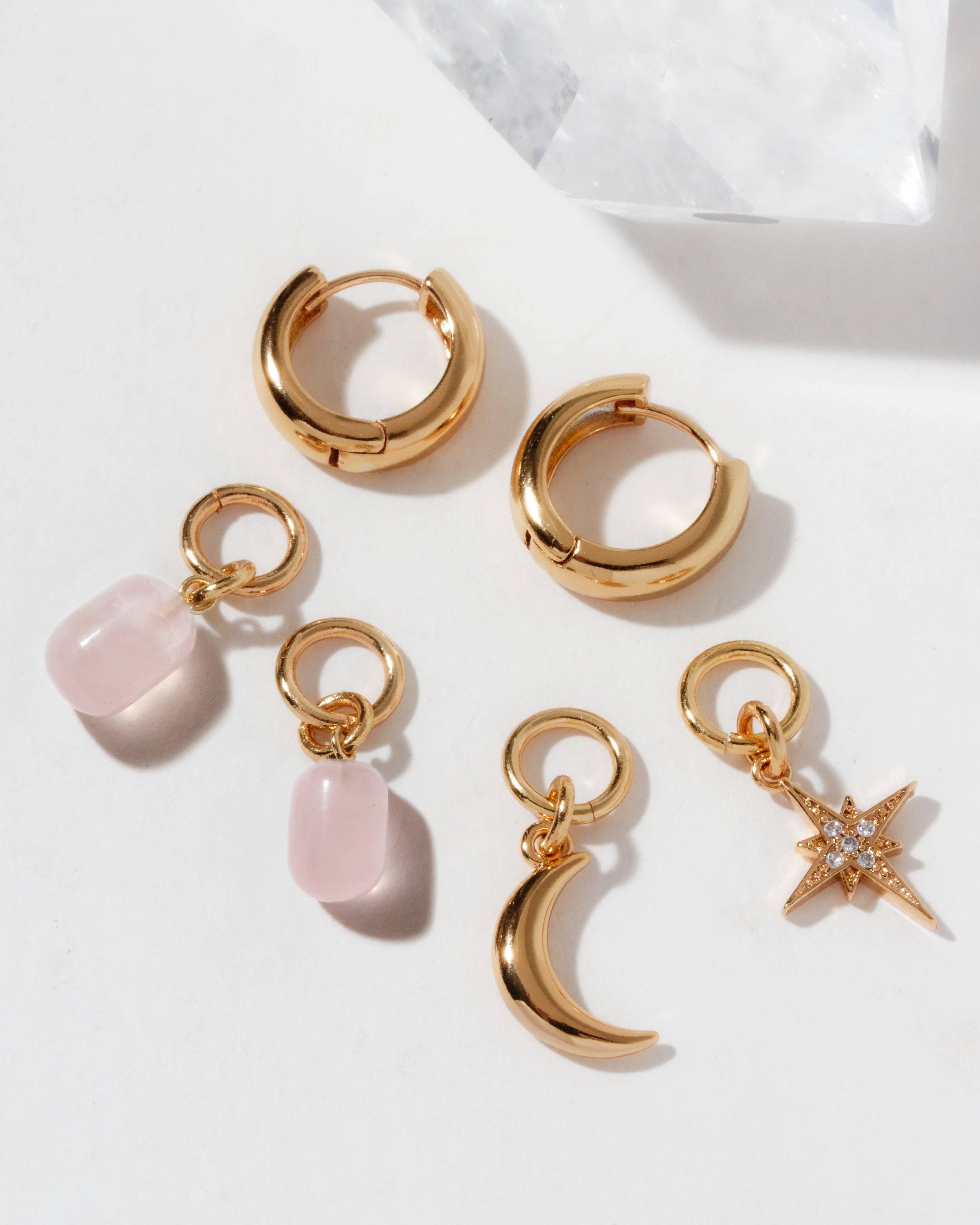 This earring trio has a little something for everyone! Featuring our signature raw-cut tourmaline stud earrings, the set also includes triangle stud earrings and mini hoops with CZ triangle charms. The best part is the versatility—whether worn as matching pairs, mixed and matched, or styled across multiple piercings, the possibilities are endless. This set comes in a box and is ready for gifting. Whether your customers are building their everyday staples or shopping for someone special, this trio checks all the right boxes. * 14KT Gold Plated Brass * Genuine Tourmaline * Hoop size: 0.5" diameter, total earring length with charm: approx. 3/4"