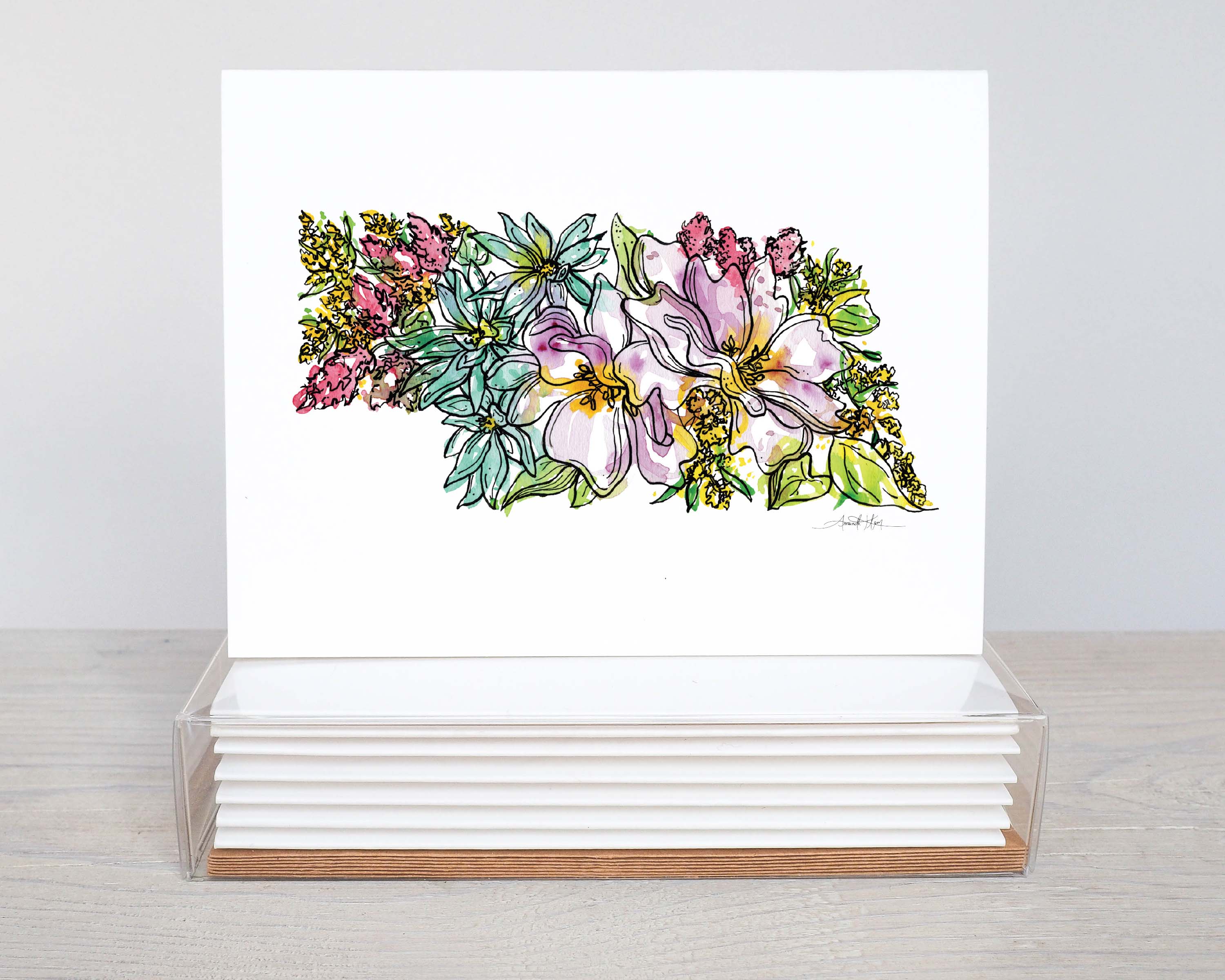 Sure to be a new best seller! Our red wine note card box set features 8 blank notecards, 8 kraft envelopes, and 8 envelope stickers. The original Red Wine piece was created by hand in Amanda Klein’s signature floral style using liquid watercolor and acrylic ink. We also offer a frameable companion print option. ➔ Each set includes: 8 blank note cards, 8 Kraft envelopes, and 8 custom envelope closure stickers secured neatly in an easily displayed clear stationery box. ➔ All note cards are small batch printed on heavy cotton paper and are 5 ½” x 4 ¼”. ➔ The back of each note card features a coordinating image matching the design from the front. ➔ Kraft envelopes are recycled, handcrafted, and are 5 ¾” x 4 ⅜” (A2 size) ➔ Envelope closure stickers are Amanda's signature Magnolia print and are 2” round. ➔ 100% made in the USA // Woman owned + operated ➔ Sold in sets of 6 for $10 each ➔ MSRP $20.00 per box set