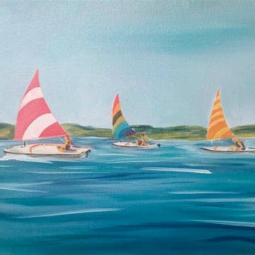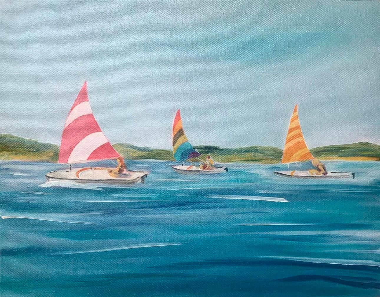 -Sunset Sailboats Art Print Watercolor art print Printed on 100 lb high quality smooth satin cover paper Packaged in a cellophane sleeve with sturdy backer. -Painted & designed by KelseyMDesigns, a woman-owned company based in Denver, Colorado and printed in the USA Please note that frames are not included