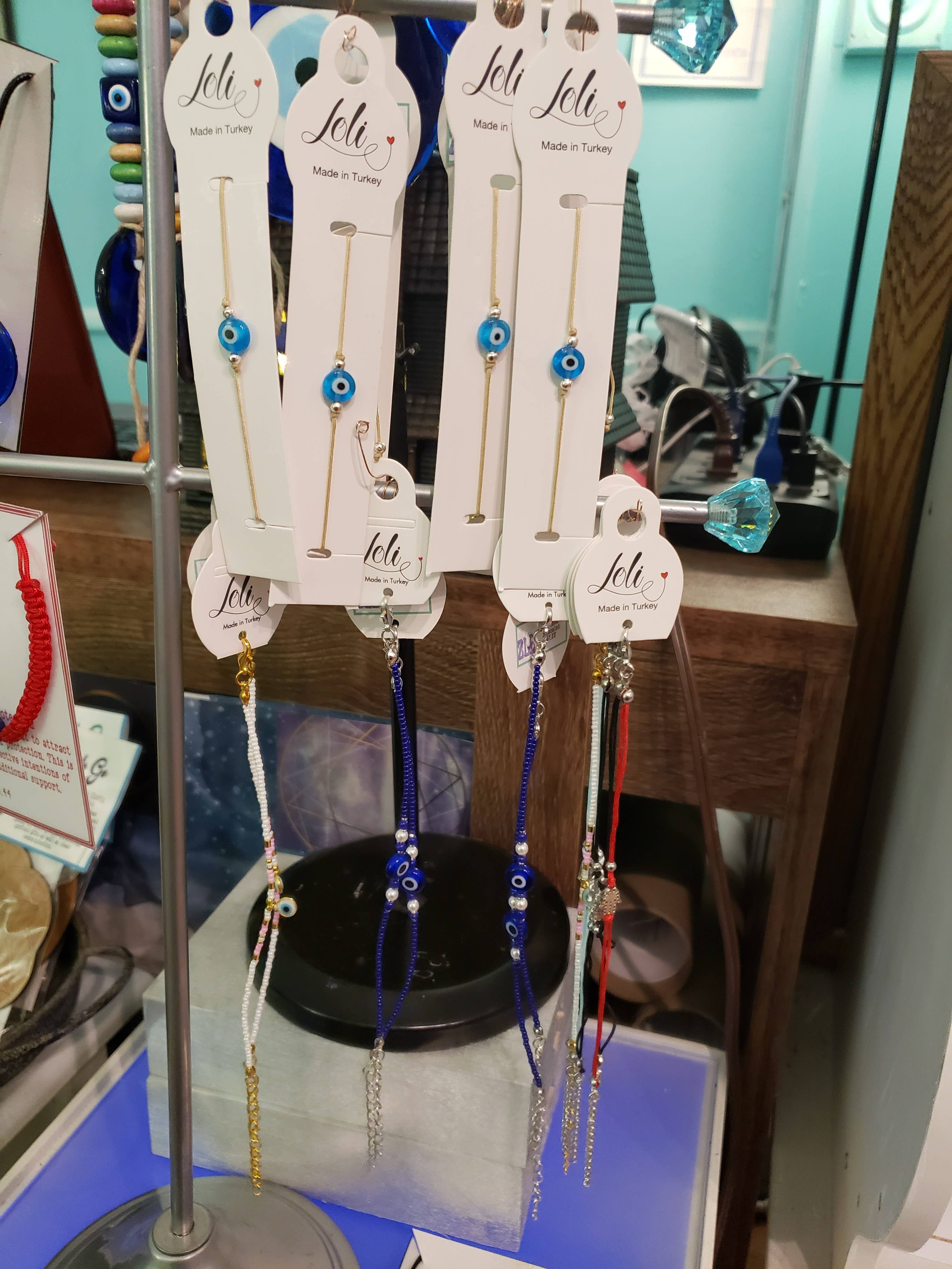 Add meaning, simplicity, and everyday style to your jewelry wall with our Adjustable XS Evil Eye String Bracelets. Handcrafted in Turkey, each bracelet features the classic protective evil eye charm on a durable nylon cord — lightweight, comfortable, and perfect for stacking. Designed for all wrist sizes, its sliding adjustable knot makes it a customer favorite for daily wear and gift-giving. Retailers love this item for its universal appeal, fast sell-through, and strong margins. Perfect for boutiques, gift shops, metaphysical/crystal stores, teen shops, and impulse-buy displays. ⸻ ✨ Features • Handcrafted in Turkey – Authentic craftsmanship & cultural significance • Adjustable Fit – Sliding knot design fits all wrist sizes comfortably • Minimalist & Meaningful – Classic evil eye charm for positivity and protection • Lightweight & Everyday Friendly – Perfect for daily wear or stacking • Durable Nylon Cord – 1mm string that holds up beautifully • Multiple Stone Options – Blue, navy, white stones available • Strong Gift Appeal – Customers often buy multiples