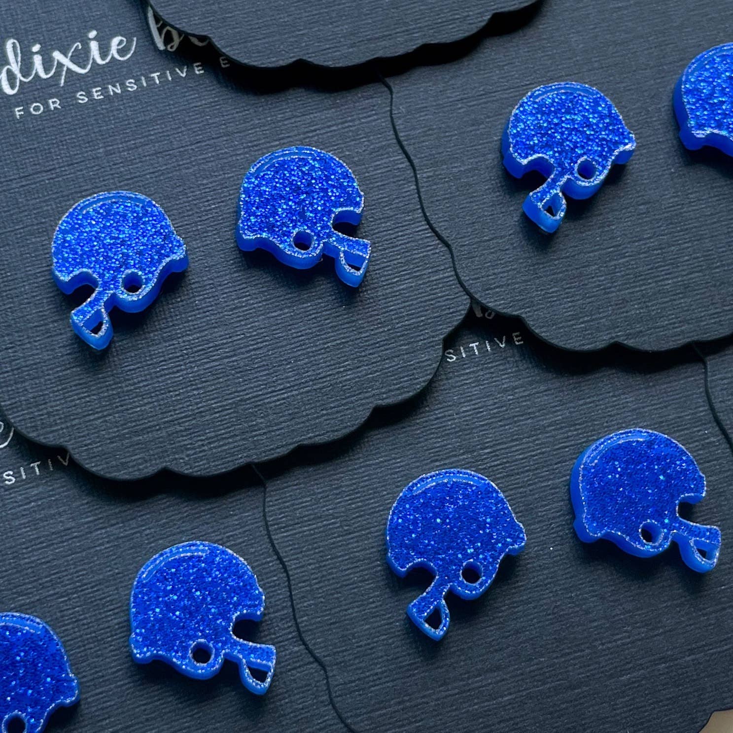 Suggested retail for one pair is 8-12! Football Helmets feature: *Dixie Bliss Exclusive design *12x14mm *Glitter Acrylic *Details are cut through the acrylic *Hypoallergenic surgical stainless steel posts *Great for sensitive ears! *Made in the USA