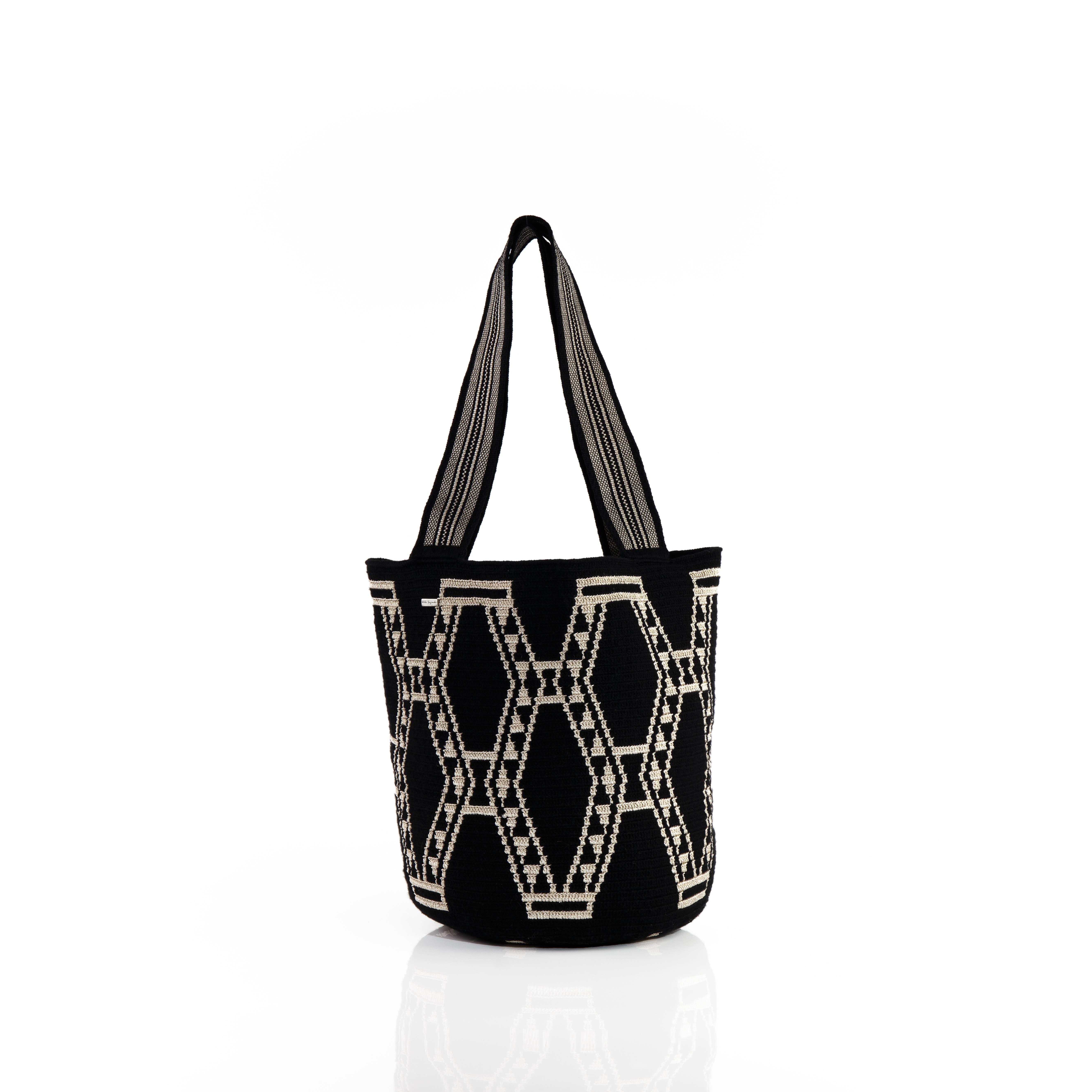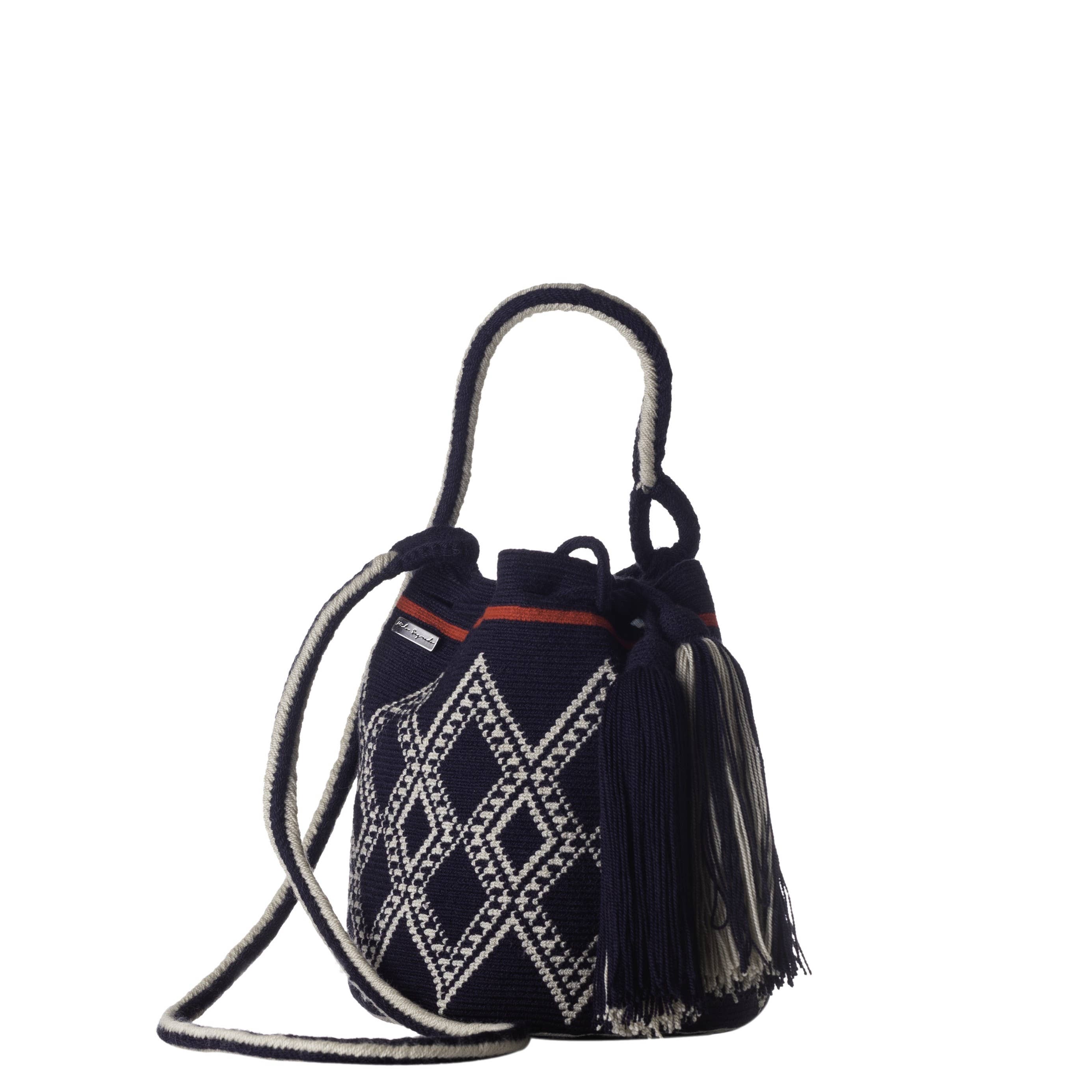 The rich cultural heritage of the Wayuu is carefully woven into each mochila. These one-thread Wayuu bags are crocheted by hand through traditional techniques that have been passed on from generation to generation. The process can take over a month to complete, resulting in an object that is not just a bag, but a reflection of deeply rooted traditions and values. On the surface, the bucket-shaped mochila features bold and bright patterns that are designed by the Wayuu people. Each mochila has a unique, natural and bohemian appeal. A sturdy shoulder strap makes the bag a functional item that is convenient for both work and leisure use. DIMENSIONS Bag: 12 x 9.4” / 30 cm x 24cm Strap: 47” / 120 cm Our products are 100% handmade, therefore each bag might slightly differ from these dimensions. MATERIAL: Acrylic PRODUCTION TIME: 7 to 9 weeks