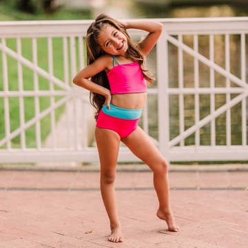 Girls Crop Top Details: Long Line crop top gives you a supportive fit and allows movement for all different body types U- shape neckline, Racerback Longer length to cover little tummies Band at hem for easy wearing. Fabric & Care: Made from Nylon /Lycra Fabric imported from the UK and garments made in Australia All fabrics have a different amount of stretch, therefore sizing may vary from fabric to fabric. Please Note Shades and Prints Can Vary. Sizing: Model wearing Size 10 view measurements of the model click here If unsure of sizing we always recommend going up so your little one will get lots of wear from their amazing activewear!!