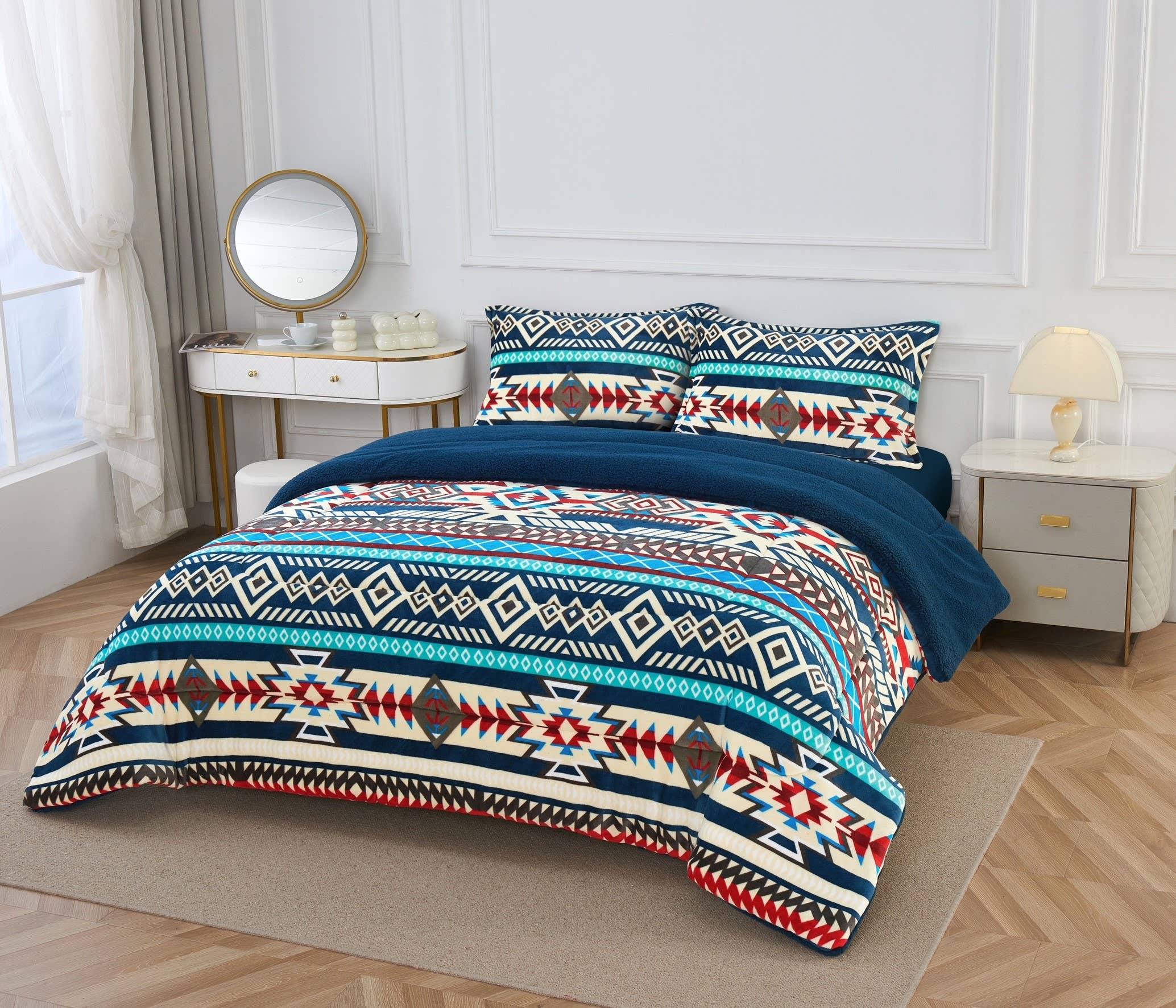 Cuddle up and get cozy. Create a southwestern atmosphere in your bedroom with our Southwestern Aztec Blue River Lodge Sherpa Fleece Blanket - 3 Piece Set. This collection features a very soft fleece facing with a light beige sherpa backing.Add a lodge life ambiance to your home with this lovely sherpa blanket set. perfect for cuddling, watching TV, reading, or getting a good night's sleep. Dimensions Twin set includes twin bedspread (68" x 89"), 1 pillow sham (20" x 26") Queen set includes queen bedspread ("92" x 96"), 2 pillow shams (20" x 26"), King set includes king bedspread (110" x 96"), 2 king pillow shams (20" x 36"),