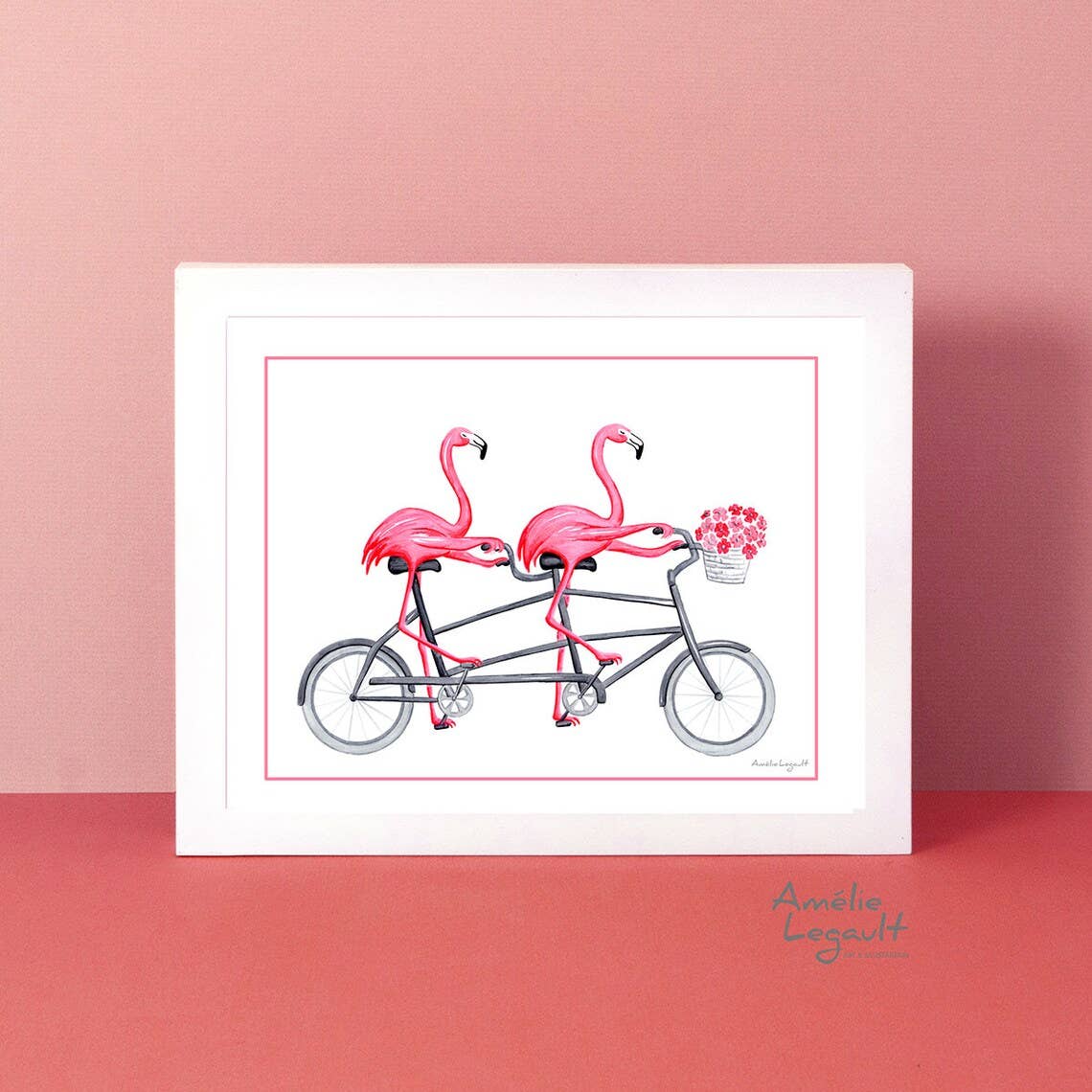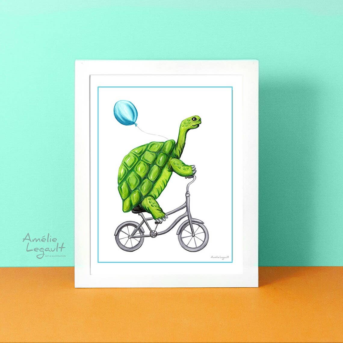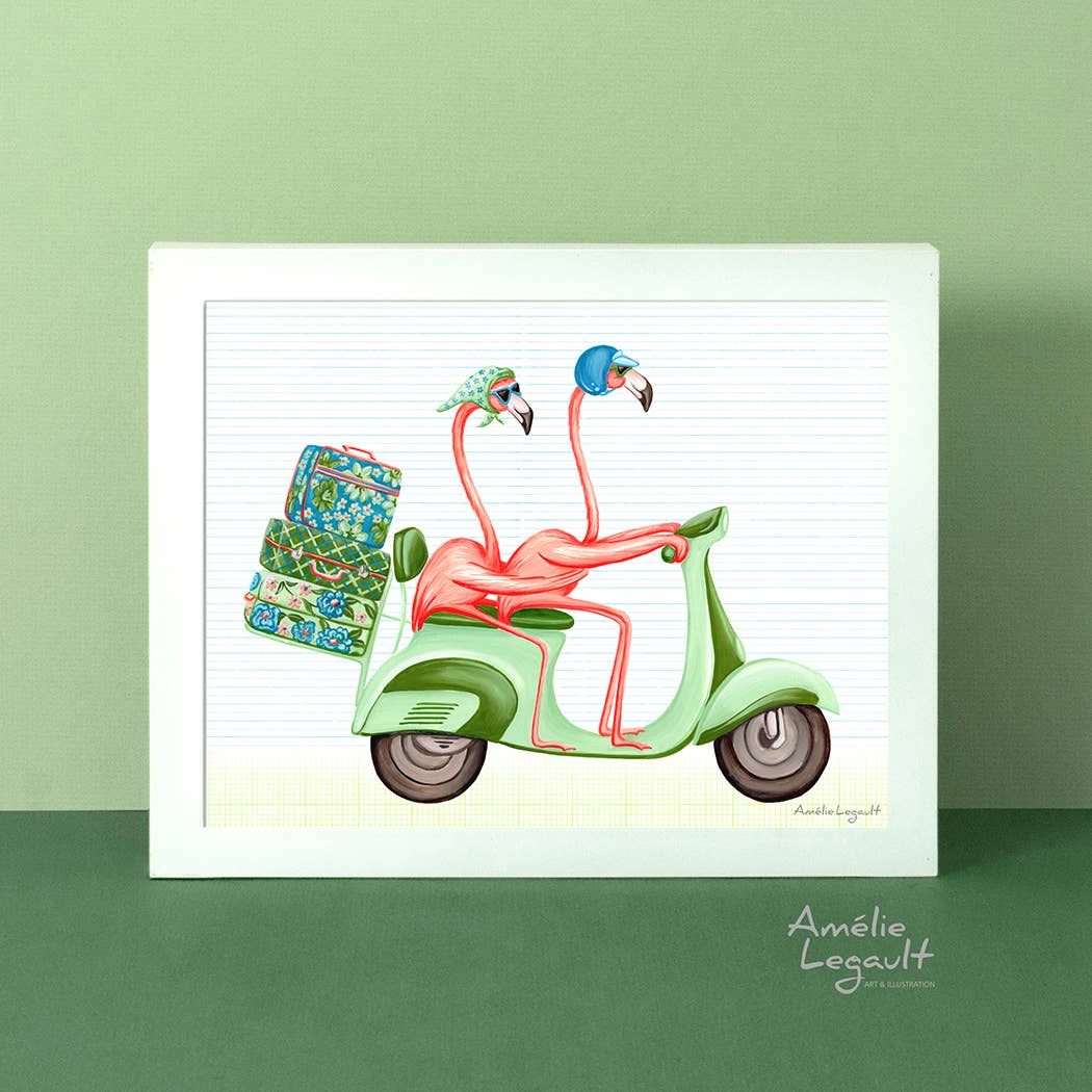 A cute chicken family on their tandem bicyle! The perfect artwork for the kitchen. 8'' x 10''. (20.3 x 25.4 cm). Gallery quality print from an original gouache painting. Printed on archival matte paper (192g/m2). Carefully packaged in a cello sleeve with a white backing board behind. Signed. Frame not included. Also available as a greeting card.