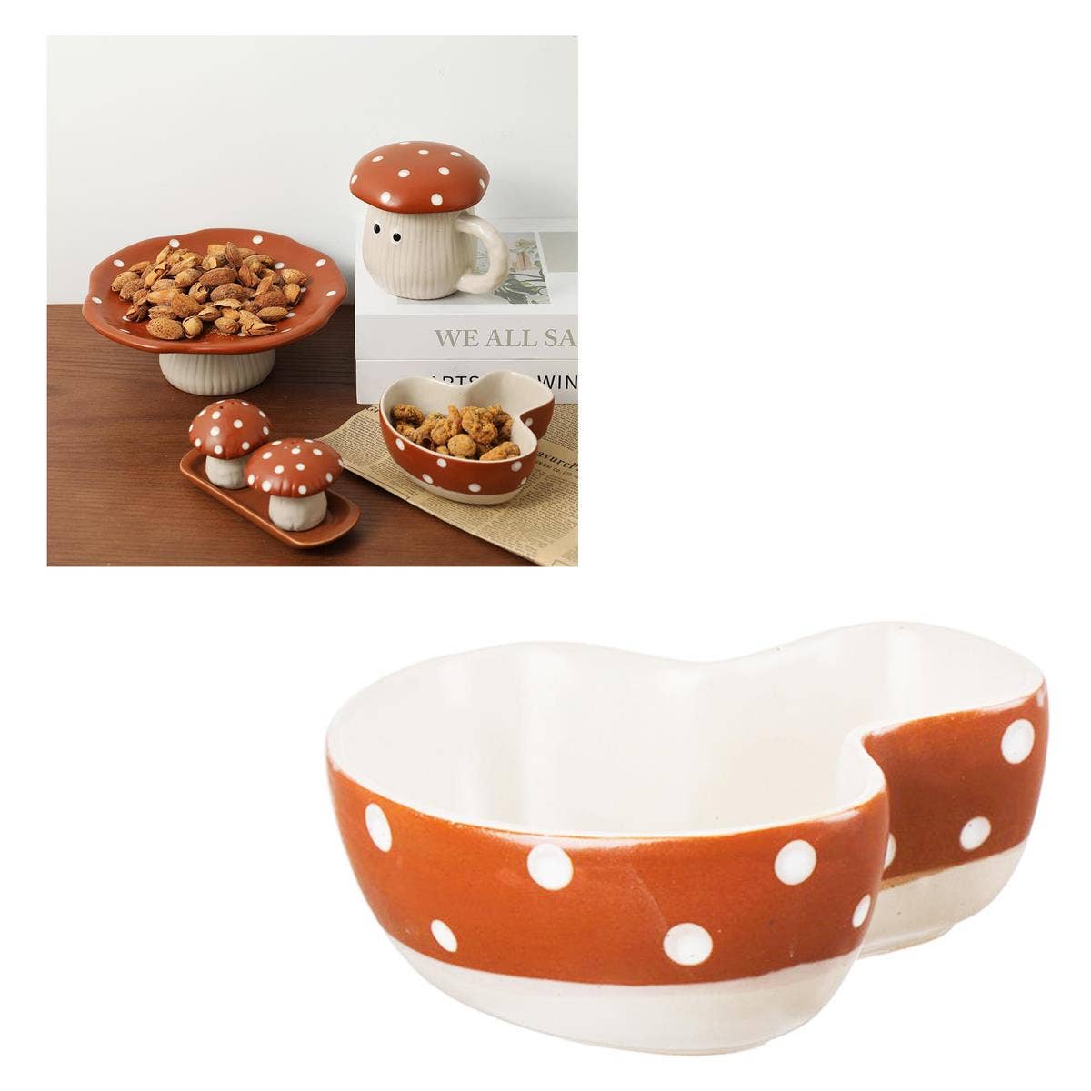 Transform your dining experience with these delightful Mushroom Salt & Pepper Shakers, perfect for setting a whimsical woodland table! These charming shakers not only add a touch of enchantment but also make seasoning your food a delightful affair. Crafted from cream-colored ceramic, each shaker features a playful mushroom shape, complete with vibrant red caps sprinkled with cheerful white spots. One shaker has two holes for salt, while the other has three for pepper, ensuring precise seasoning control. Simply remove the plugs from their bottoms to fill them with your favorite spices! Ideal for casual meals or special gatherings, these adorable shakers will infuse your dinner table with a fun and enchanting touch.