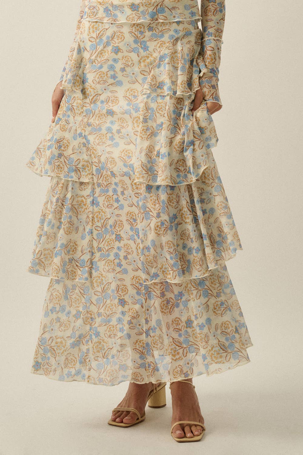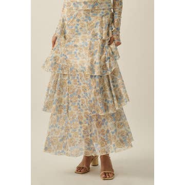 Floral print trimmed maxi lace skirt with lining. This stunning maxi skirt features a beautiful floral print trim that complements its intricate lace overlay. The skirt is fully lined for added comfort and modesty, making it perfect for any occasion. The flowing silhouette and delicate lace detailing create a feminine and elegant look, ideal for pairing with a simple top or blouse for a chic ensemble. -Model is 5'9" and wearing a Small
