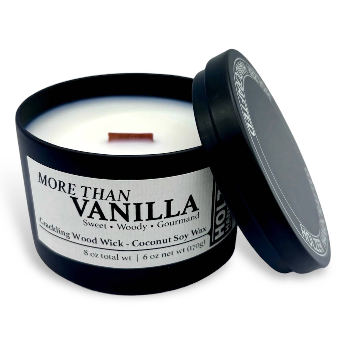 Crafted with hand-poured premium coconut soy wax, a wood wick, and luxury fragrances. The wood wick's subtle crackling sound completes the immersive, sensory experience that lasted about 45 hours (fifteen 3-hour sessions) during our extensive testing! WAX - USA-sourced coconut and soy waxes. Eco-friendly and clean burning. WOOD WICKS - Wood sourced from FSC-certified mills in the USA for sustainability. FRAGRANCE - We only use high quality candle fragrance oils (and ingredients) that are vegan, cruelty-free, phthalate-free, toxin-free, mutagen-free, gluten-free, allergen-free, carcinogen-free and paraben-free. 6oz net wt. in an 8oz tin. Lid will display "Holzer Handcrafted". 2.375" T x 3.125" W Keep YOUR customers coming back for a unique candle they can only get from YOU! ADD customized co-branding: NAME THE CANDLE, we'll design a label with YOUR LOGO & ours. Possibilities are endless and we’re here to make it happen! Minimum of only 6 units per custom label (24 total)