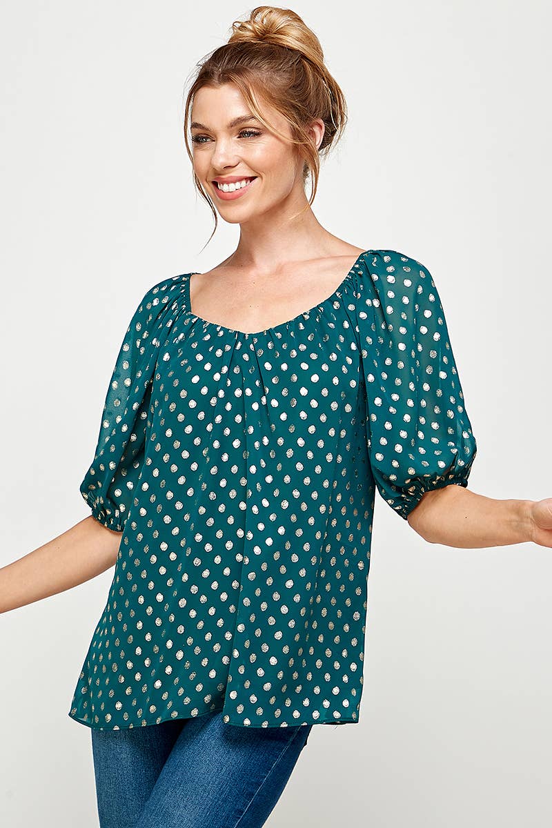 Womens Bow Print Contrast Puff Sleeve Mix Media Top