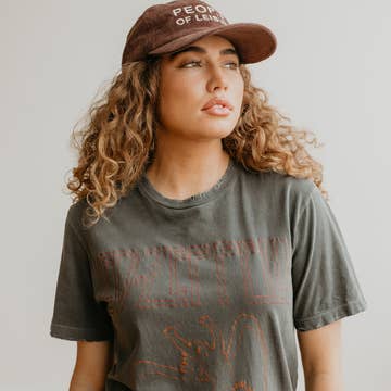 The twin jackrabbits of the desert are a sign of great change, and even greater luck. Strange things happen in the southwest, but that doesn't mean one can't use these omens to their advantage. Womens long sleeve crop tee in Mustard. Drop shoulder seams and a raw bottom hem. Main model wears size X-Large.