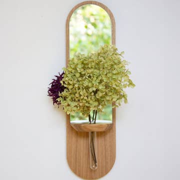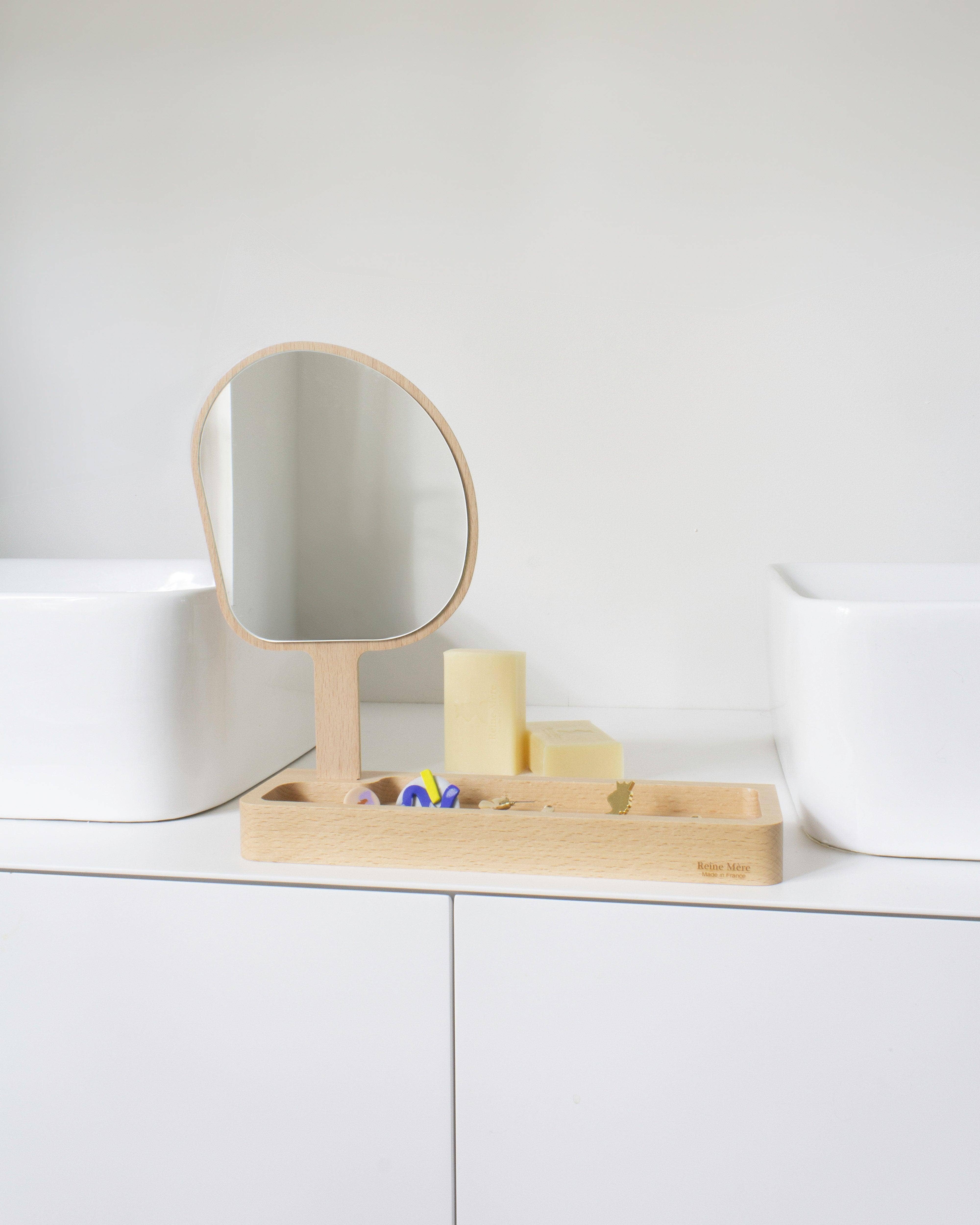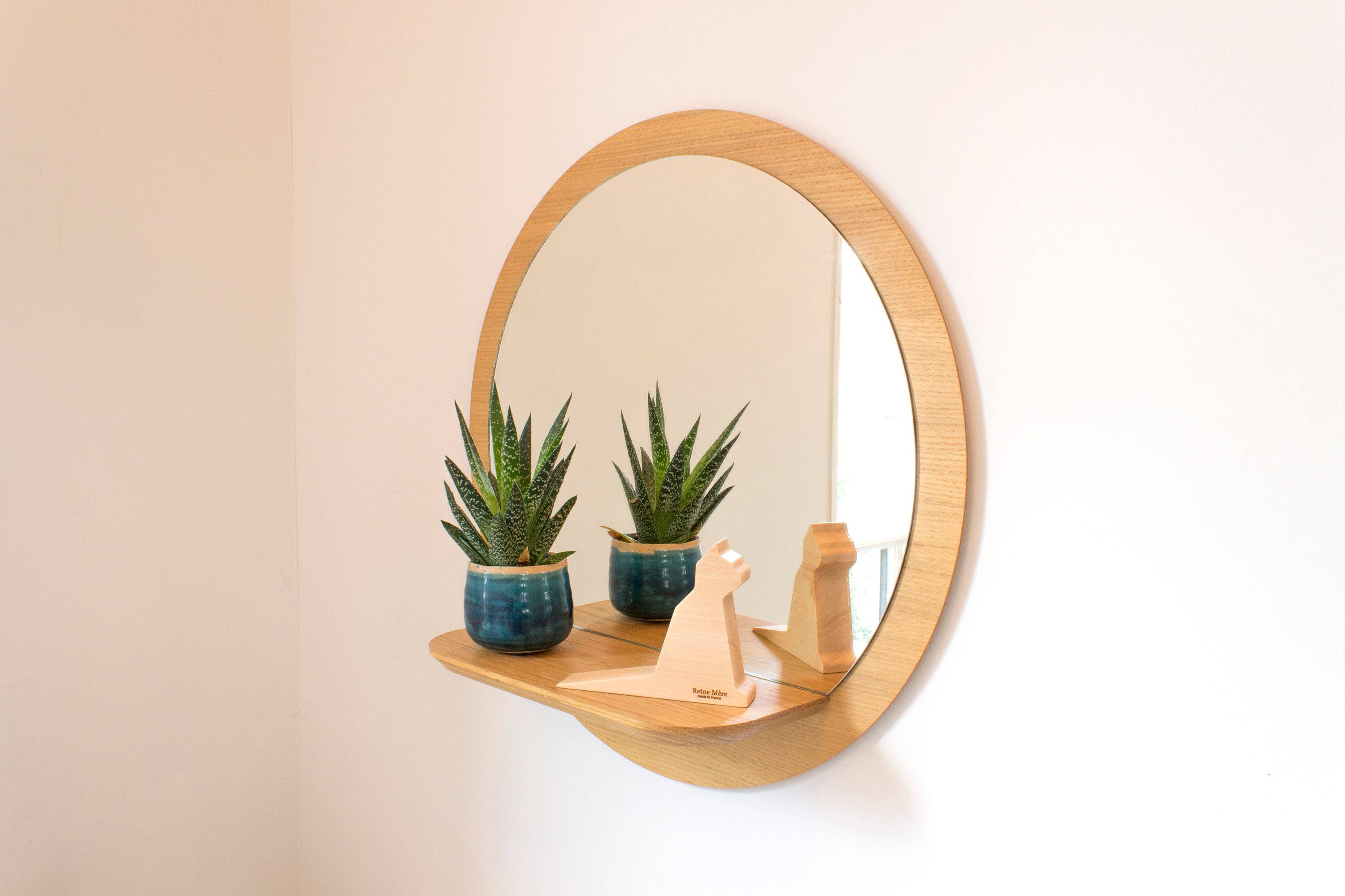 Let the Sunshine In! Here is a must-have from Reine Mère! Thanks to its solid oak shelf, the Sunrise is the ideal mirror for a bathroom or an entrance with its rounded design. Timeless and iconic. Available in three sizes. Oak-veneered medium mirror and copper-free glass mirror, made in Toulouse, Jura and Yonne.