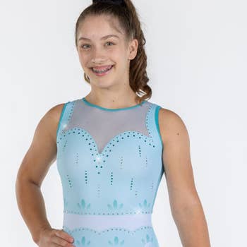 Super soft sleeveless striking leotard with V-neck in a trendy floral with hummingbird print on a bright blue background to get you in the gymnastics mood! Contrasting bottom in raspberry pink finished with silver glitter on arms, neck and strap on the waist. Super soft recycled fabrics.