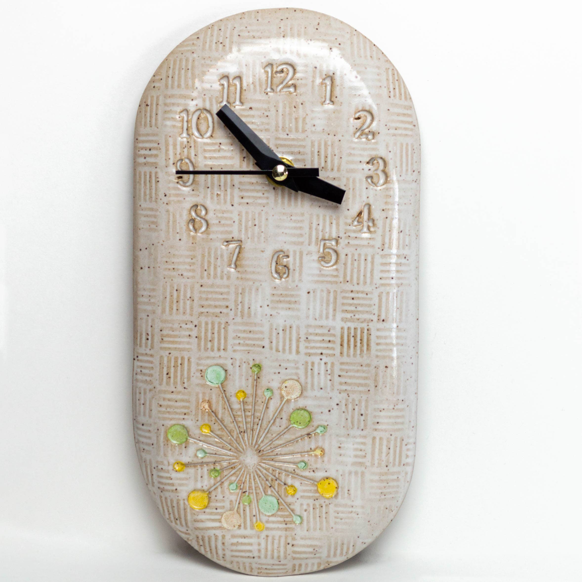 New pendulum clocks!! Beautiful flower blooms transformed into a decorative hanging timepiece. Our swinging pendulum clocks are a fun way to keep time with nature! All units are sold in singles. Approximately 6" wide x 9.5" High. Uses one aa battery, not included. Upc: 835721760014 sku #76001 all designs are copyrighted.