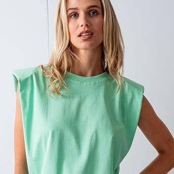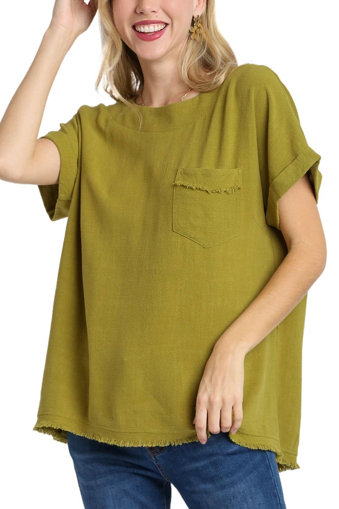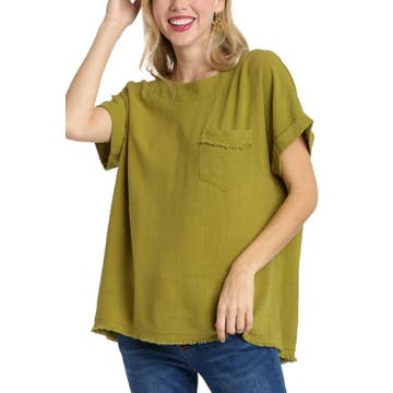Upgrade your style with the Zoie Top features a short rolled sleeves for a lived-in look and raw seam detailing at the v-neckline for an edgy touch.