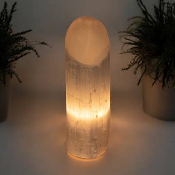 Large Selenite Lamp. 4" diameter, 10"-12" tall. Includes cord and bulb. Min. 1 Illuminate your space with the ethereal glow of our Large Selenite Lamp. Crafted from genuine crystal, this mesmerizing piece brings a touch of spiritual ambiance to any room. Perfect for wholesale purchase, it's a captivating addition to holistic and wellness spaces.