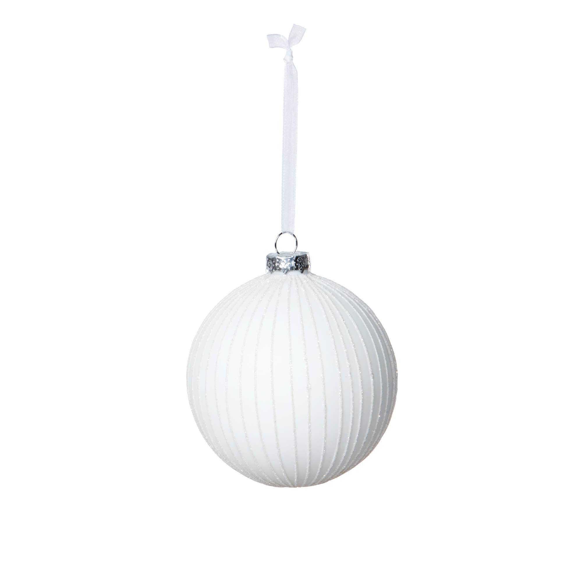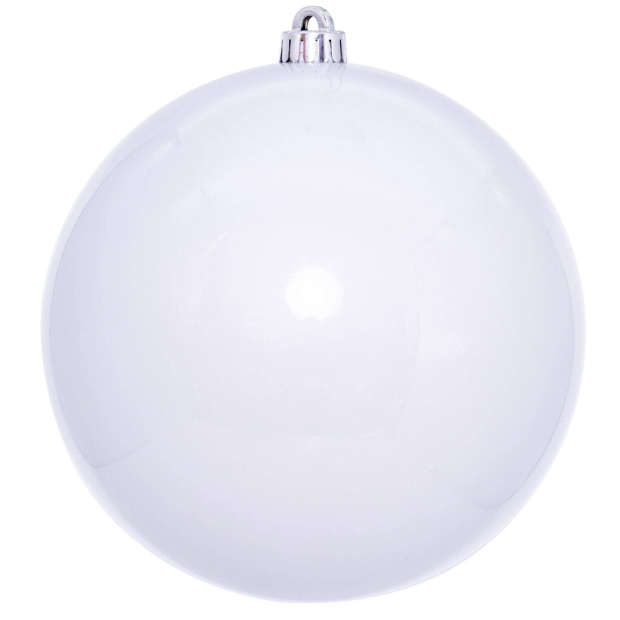 Vickerman 4.75" White Pearl UV Drilled Ball Ornament. Green wire is looped through the cap for durability. Made with shatterproof plastic. A UV finish protects the ornament for seasonal outdoor use. Includes 4 ornaments per bag.
