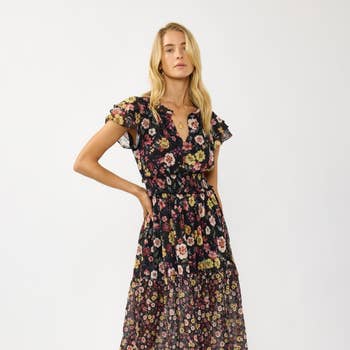 ABSTRACT TULIP SLEEVE MIDI DRESS - ELASTIC WAIST, SIDE POCKETS AND LINED, TIERED, SHORT SLEEVE, V NECK, EASY, CASUAL, EVERYDAY SMALL: TOTAL LENGTH - 49" MODEL IS WEARING SIZE SMALL. SELF: 100% POLYESTER LINING: 100% POLYESTER * Due to lighting and differences in monitors, actual colors may vary slightly from what appears online.