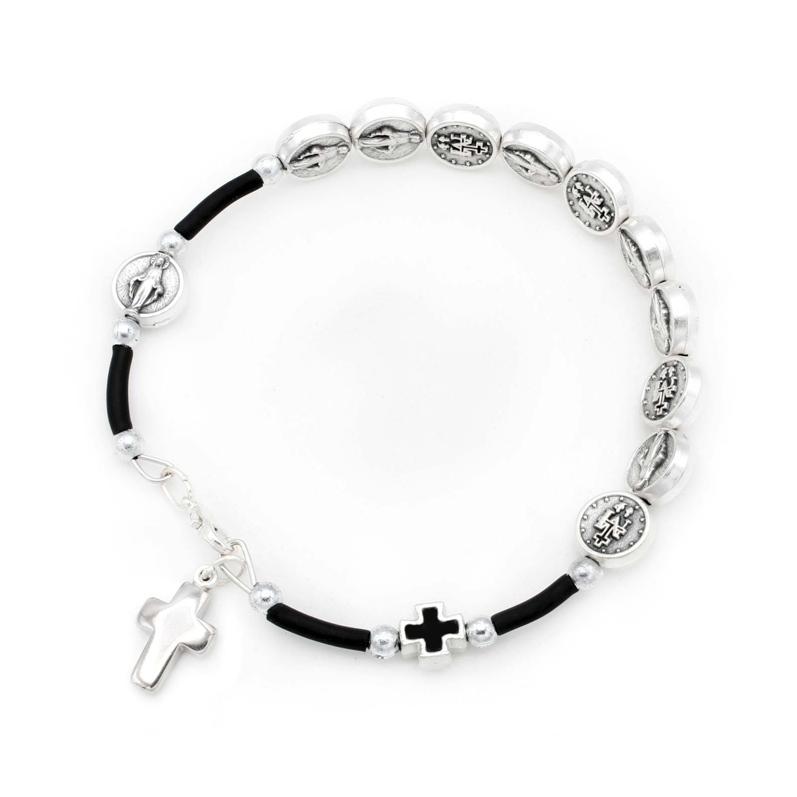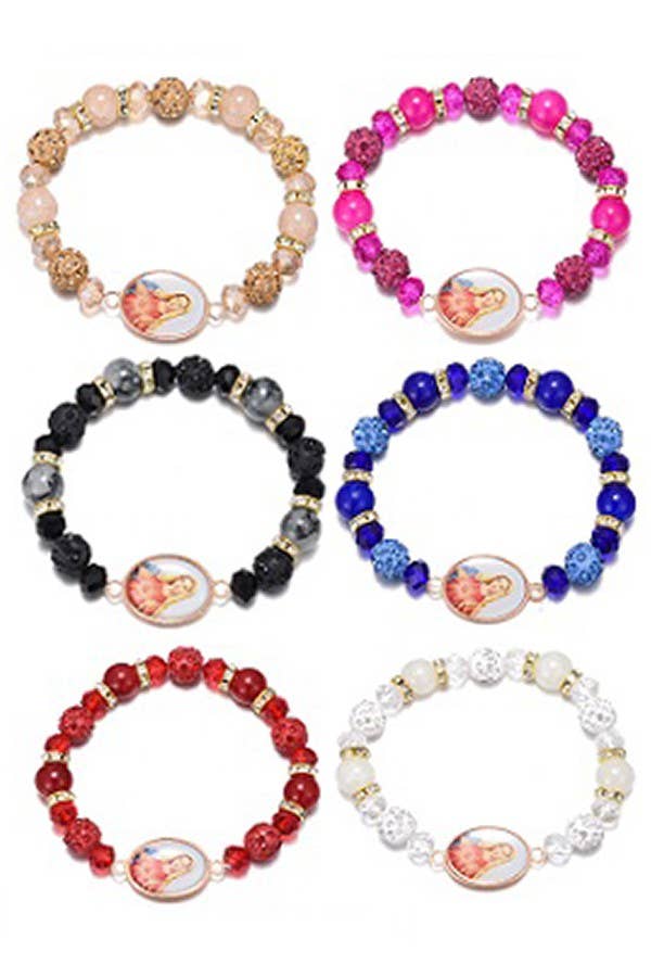 The Saint Padre Pio Bracelet features a round Saint Padre Pio medal on a 5mm beaded stretch design. Includes a prayer card for healing and hope. Available in gold, silver, and gunmetal. Sizes include 6.5", 6.85", and 7.5".