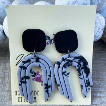 Handcrafted polymer clay earrings with stainless steel studs. Black spiders adorned with maroon flowers and silver leaves.