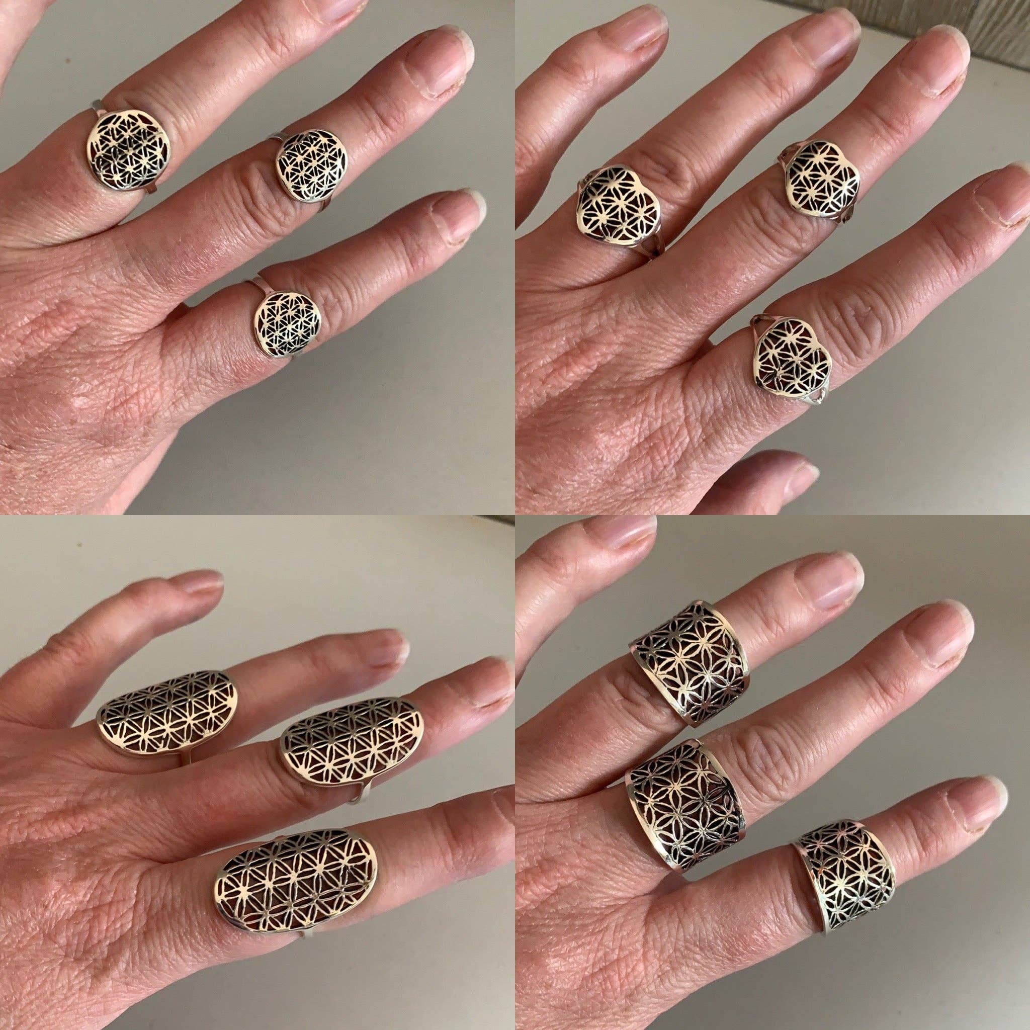 Two different wide silver rings with 17 mm diameter. The first one (left) is a wide rhombus ring with minimal shapes on it, and the second one (right) is a wide round ring with a unique design that is 100% different from all the other rings. Both of them are made from metal. DIMENSIONS - Rings Diameter is 17mm (0.67'') - US 7 - Both Rings are Slightly Adjustable. MATERIALS - Rings are made from Peweter. PROTECTION - Make sure that you do not stress or open and close your ring too often because it is only natural that is going to break! When you want to adjust it, do it gently and never go outside the size spectrum that I describe at every ring. - Protect it from water, parfumes, hair and body lotion to keep them bright and shiny for years. * IN THIS LISTING THERE ARE TWO DIFFERENT RINGS. IF YOU 'D LIKE THEM ALL, YOU HAVE TO PURCHASE BOTH DIFFERENT STYLES.