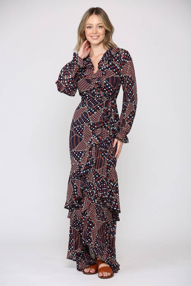 Step out in style and let your outfit do the talking. This mini dress features a diamond geometric pattern, half balloon sleeves, a ruffle neck trim, smocked front and back bodice, and a neck button that creates a chic keyhole detail. Complete the look with block heels, a mini handbag, and statement earrings. - Abstract - Smocked - Mini - Pockets - Color: Burg Blue Size + Fit - Model is 5'9" and wearing size XS - Measurements taken from size S - Chest: 14 1/4" - Length: 35 1/2"