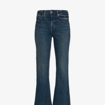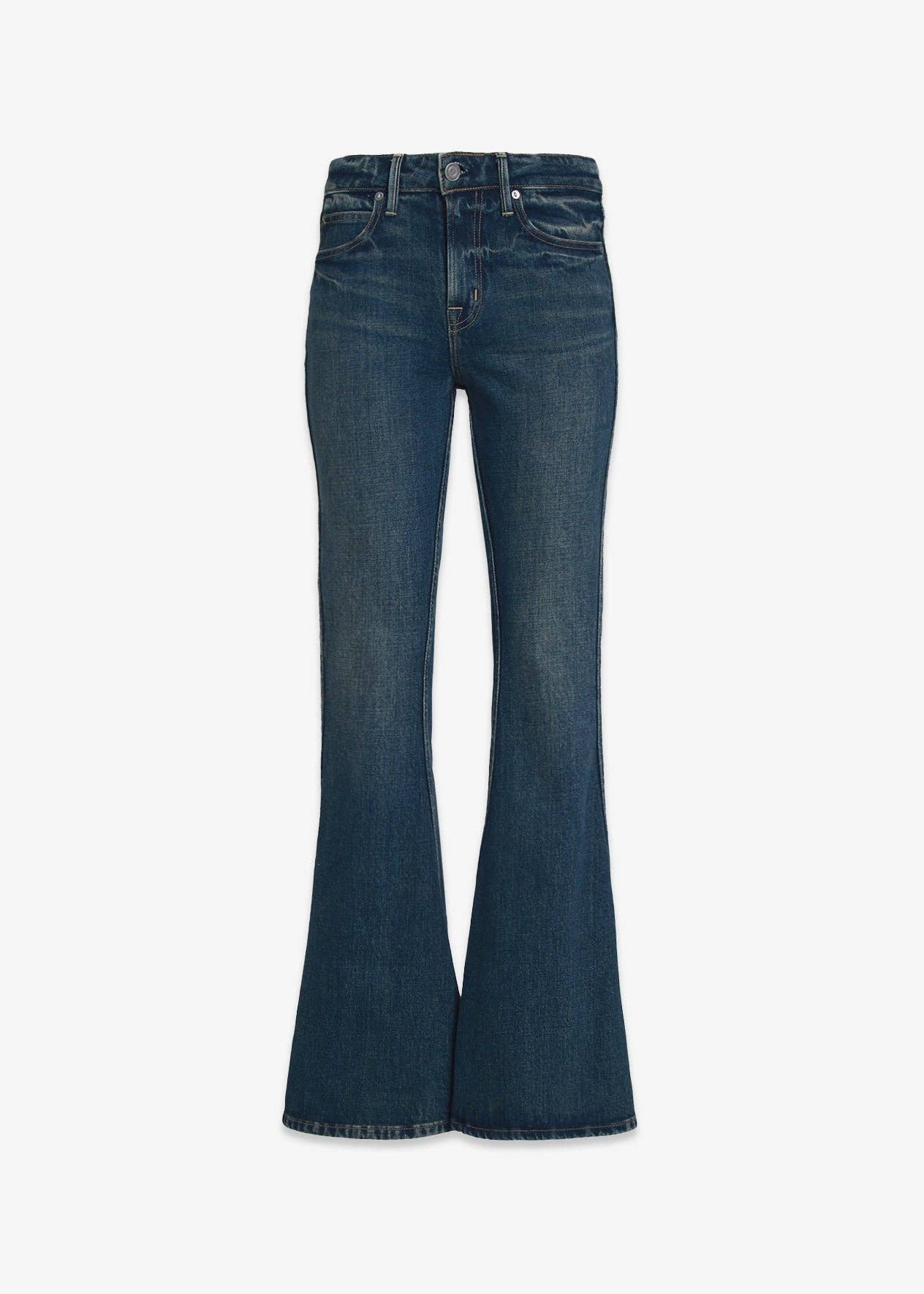 HIGH RISE FRONT POCKET W DART DETAIL FLARE JEANS COMFORT STRETCH DENIM, HIGH RISE WAIST, FRONT PATCH POCKET WITH DART DETAIL, FULL LENGTH, FLARE JEANS F. RISE: 10 1/2" / INSEAM: 33" / LEG OPENING: 20 1/2" MODEL IS 5'10" WEARING A SIZE 26