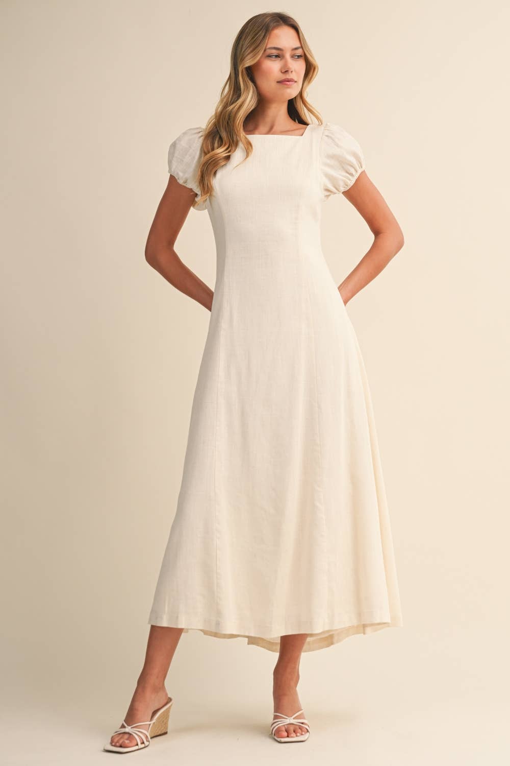 Features: * Ladies Midi Dress * Polyester and Cotton * Fabric No Stretch * With 100% Polyester Linning * Solid Color * V-Neck * Short Bubble Sleeves * Elastic Waist * Casual Fitting * True to Size Package:  * Package include 1 * Ladies Midi Dress Model Fitting:  * Model wearing size S  * Model Size:  Height - 5'7" Bust - 33"  Hips - 34.6" Waist- 24.4"  Note:  * We have different sales discount in 3%/5%/10% for our retailers, please feel free to shop  * Color may vary due to lighting on images, filter for the picture, different display.  * Please refer to the size chart  * Any problem please contact with our customer service first, we will try our best to help solve the issue.  Private Label Sew Acceptable  * Contact Us by Message  * Prepare the Label Art Work File in PDF or AI Format with Correct Size in Advance
