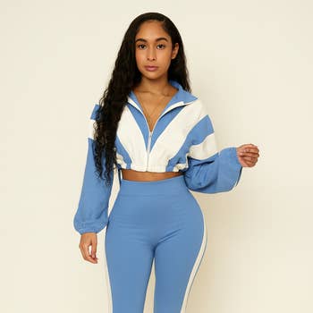 Elevate your activewear collection with this stylish blue cropped top and leggings set, designed for both comfort and performance. The set features a sleek zip-up windbreaker that provides protection against the elements while maintaining breathability. The coordinating leggings offer a flattering fit, ensuring ease of movement during workouts or casual outings. Perfect for those who value both functionality and fashion, this ensemble is a must-have for any modern wardrobe /95%COTTON 5%SPANDEX