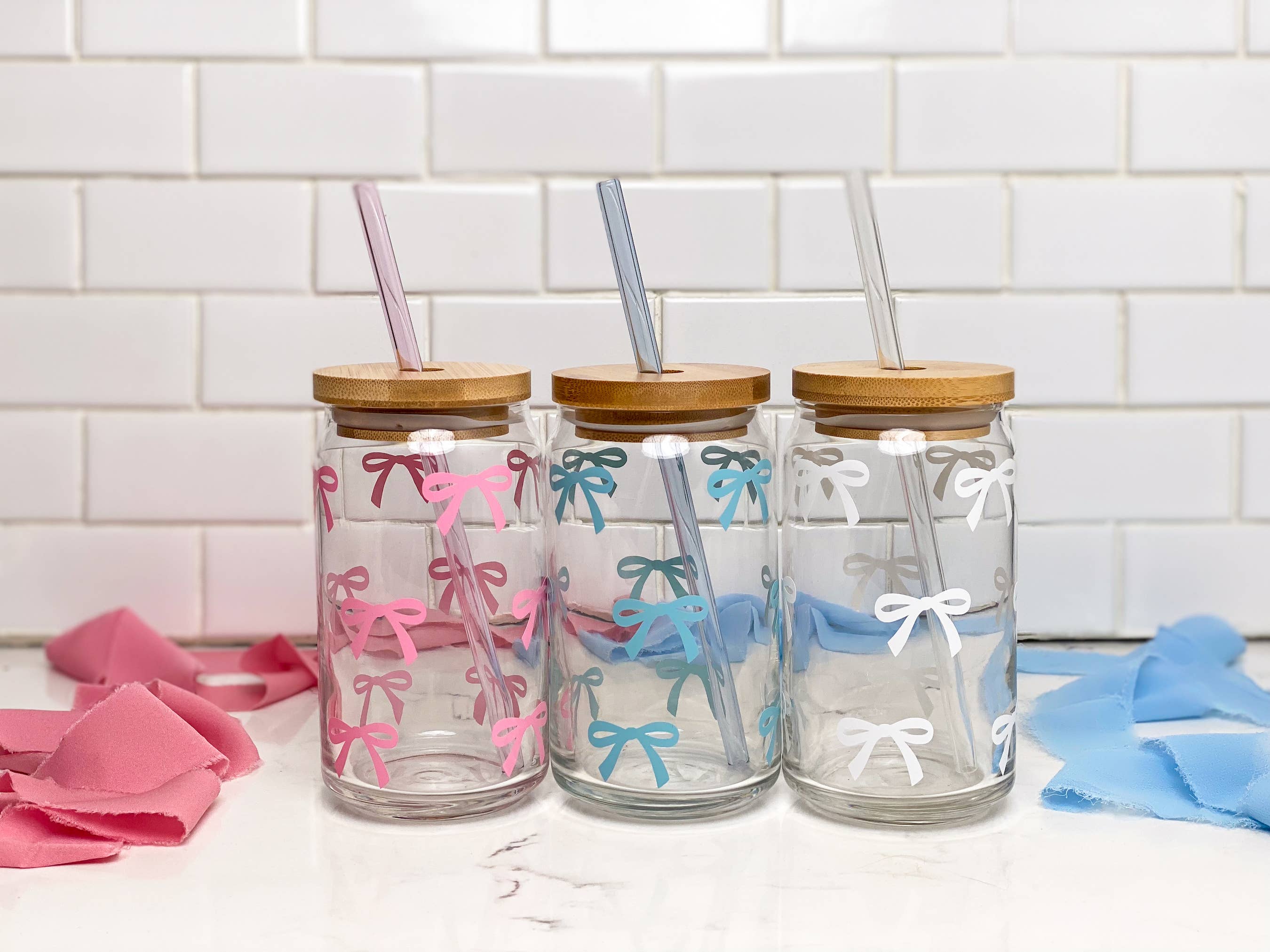 Looking for the perfect Mothers Day Gift or Valentines Day gift? This cute tiny bow clear glass coffee mug is just want you need. The cute hearts on this glass coffee cup can be done in pink, baby blue, and white ⭐️Size⭐️ -13oz -3 3/4 inches height (without handle), 3 3/8 inches diameter (top and bottom) ⭐️How to care for my cup⭐️ -Our glasses use high quality vinyl for the decal. A simple hand wash does the job to keep your cups in good shape. DO NOT soak your glass and DO NOT use in the dishwasher -Bamboo lids are made from real bamboo, to keep them from splitting or molding a simple hand wash with lukewarm water & soap will do the trick. DO NOT soak your glass and DO NOT use in the dishwasher