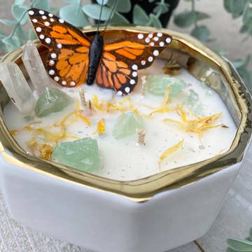 There's so much magic about the transformation of a caterpillar to a butterfly, their metamorphosis is a metaphor for rebirth, Butterflies show us how we can go within ourselves to dissolve old forms and morph, rebuilding and evolving ourselves. Invoke the butterfly symbolism with this beautiful candle. Flowers and crystals may vary, we always do our best to make it similar. 3-wick soy wax candle topped with a faux monarch butterfly, green calcite, clear quartz and a touch of magic. Scent will vary, all smell wonderful. These candles are great for gift giving and intention setting. Once ready to burn all Items must be removed. They can be added back on, after flame is out. Or can be put on an altar, night stand or special place. Burning instructions on bottom of candle.