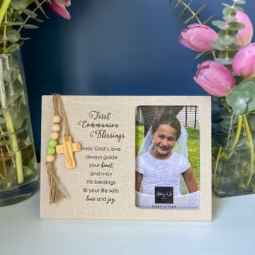 Solid wood handmade picture frame for 4”x4” photo. Main frame is painted white and lightly distressed. A wooden bead board mat painted in metallic gold (also distressed) is attached to the frame and a 4”x4” photo grade piece of acrylic holds the photo in place. A stained wooden finial is added to the top of the wooden block and a chinoiserie style wire edged ribbon is attached. Simply loosen the screws at the edges of the acrylic and slide a photo underneath then tighten up the screws. Trim your 4x6 snapshots/photos to fit this frame. Great little frames to display your favorite photos. Choose from 3 different color bows: pink, blue, light green. Overall size of block frame is approximately 7 1/4”x7 1/4”. Frame stands on its own