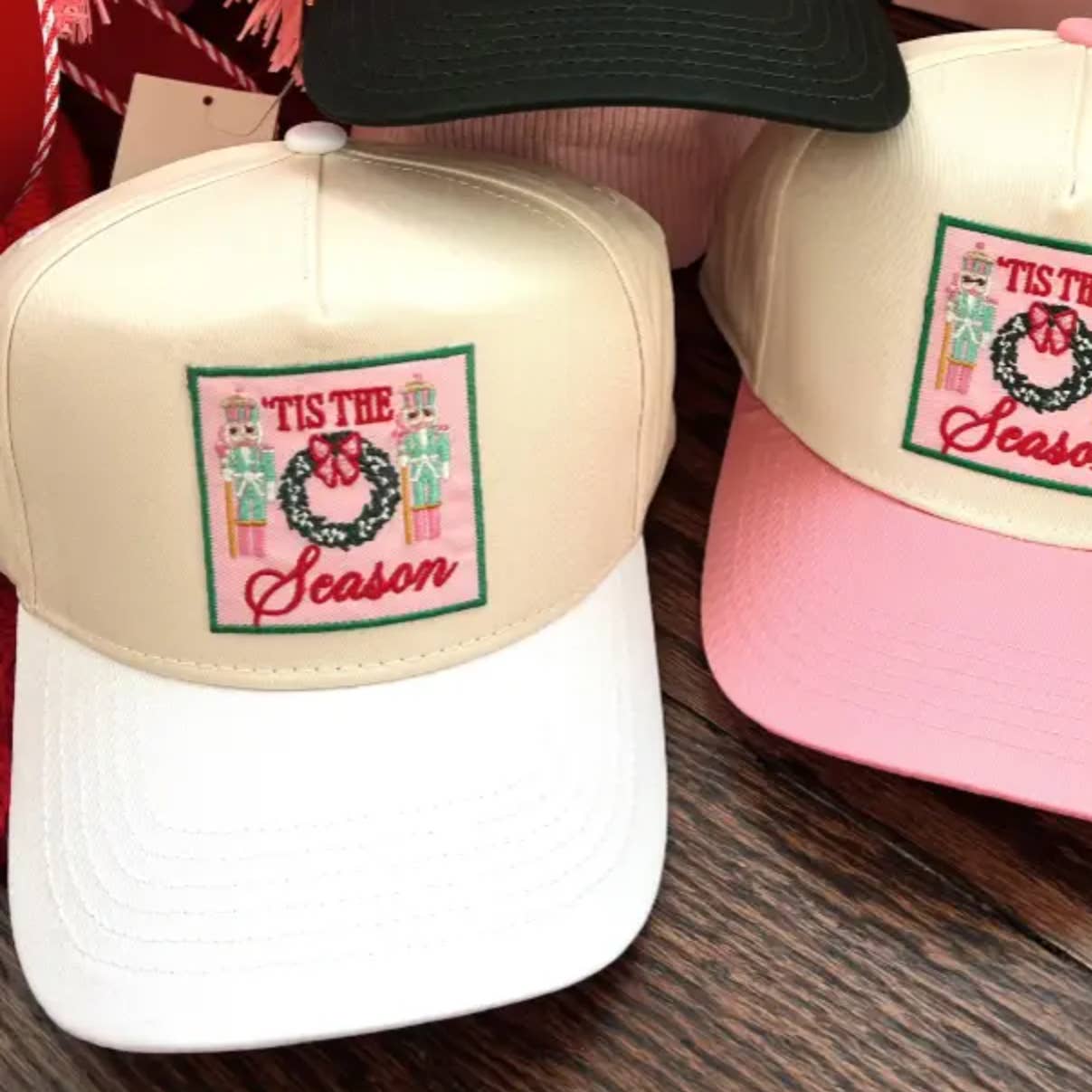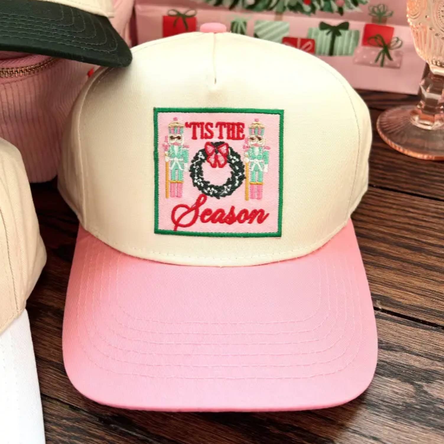 All I want for Christmas is cocktails ... the cutest hat ever! + also has 3 bows embroidered on the side! Red vintage trucker hat, with adjustable snapback
