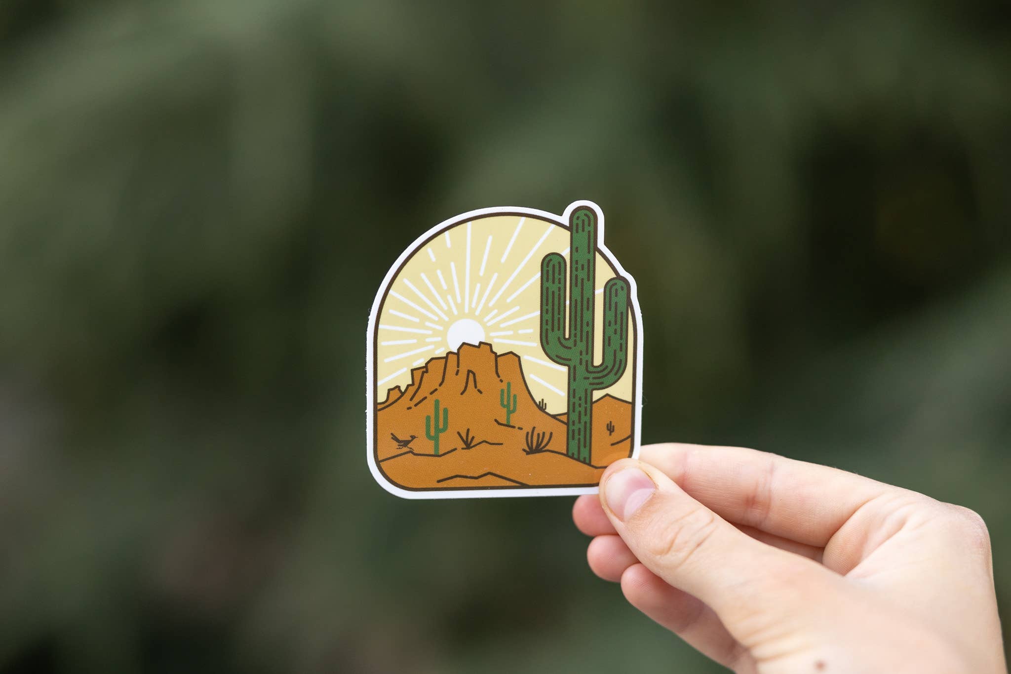 This sticker is perfect for adding a bit of desert charm to any surface. Cactus silhouettes shimmer in fading desert dusk light. Stick it on your laptop, water bottle, or desert gear. Size: 3" x 2.43"