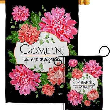 I've created this fun and graphic art flag to welcome all who visit your beautiful home! My garden flags feature the word "Welcome" in big, bold letters, the perfect contrast to the smaller quote printed below that declares to your guests: "If You're Here, You're Awesome." AVAILABLE IN 5 GORGEOUS COLOR COMBINATIONS Stand out from all the greige boxes in the neighborhood and add some PERSONALITY + COLOR to your outdoor decor with my fun and uplifting garden flags! Unique art for your front yard, garden area, patio or planter... Also makes a super unique housewarming gift for a new homeowner! Flag pole not included. // DETAILS // ✺ Choose from (2) Sizes: -> Small Garden Flag 12"x18" -> Large House Flag for Flag Pole 24"x36" (with hidden hanging loop) ✺ Double Sided ✺ Printed with dye sublimation on durable, thick 100% poly poplin-canvas fabric ✺ Vivid ORIGINAL ART by artist/illustrator Courtney B.