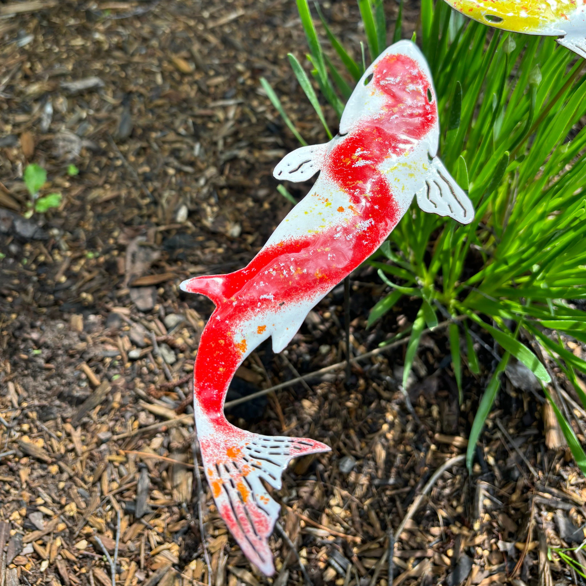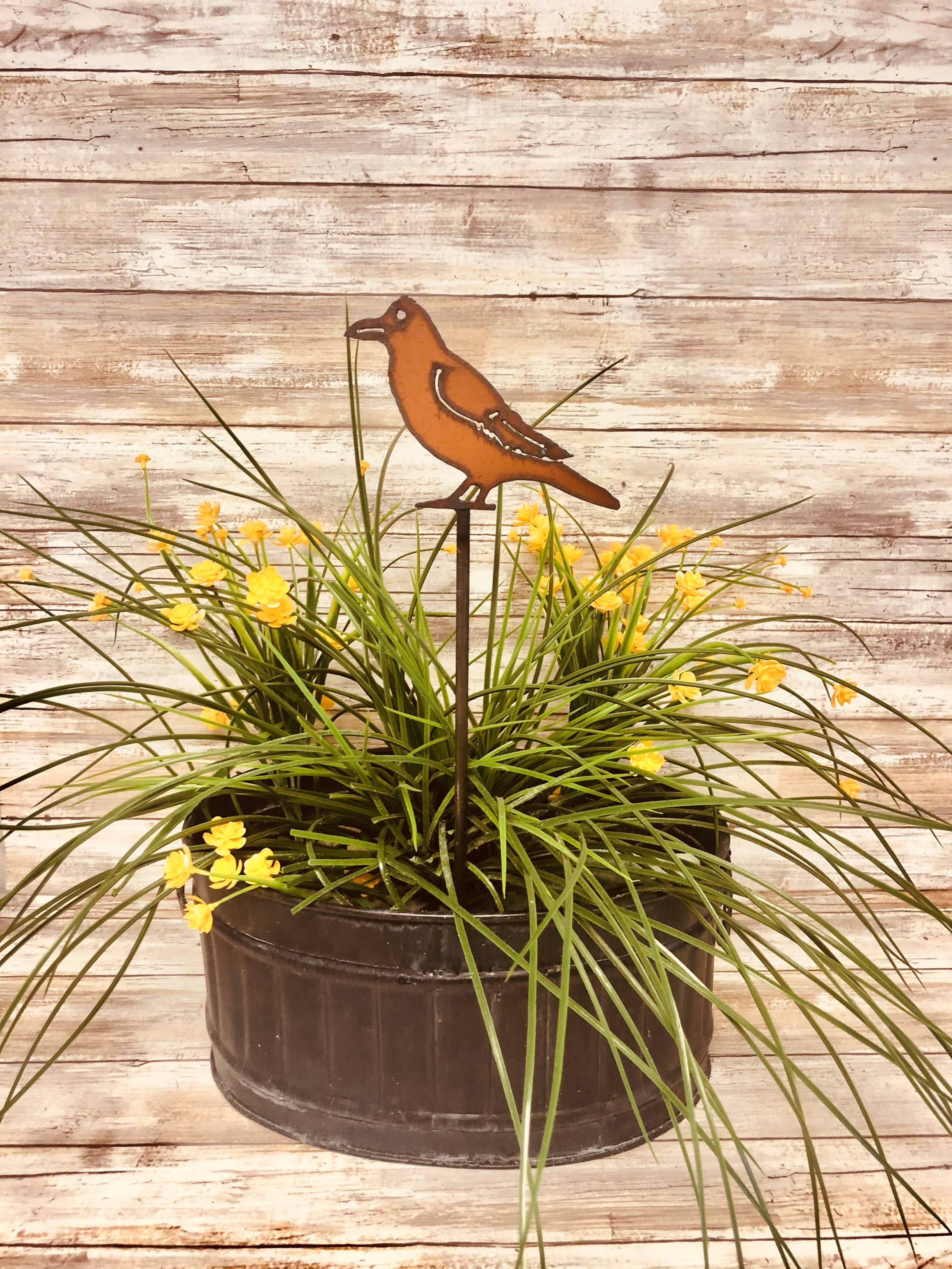 This small mouth bass metal garden stake is cut from 20 gauge steel and is designed to weather and rust. Item will come in various states of rusting process. Featuring a glass marble eye and easy "step in" on the stake. The fish is hand formed to create a slight curve of the body and the tail/fin also have a slight rounding. Measures approximately 12" (wide) x 34" (total height with stake) Please note: this piece contains small glass marble(s) that are not suitable for children and may pose a choking hazard.