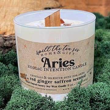 Courageous, Fiery, Independent Say hello to our Aries-inspired candle, a fiery blend designed to ignite your senses and embolden your spirit. Bold and invigorating notes of blood orange pair with spicy ginger & exotic saffron to give this candle the same dynamic and adventurous nature of an Aries. Let the vibrant aroma awaken your senses, fuel your determination and empower you to conquer challenges with confidence. Allow the fiery essence of this candle to ignite your enthusiasm and passion. This 8 oz. candle comes with a crystal that has been hand selected to amplify the Aries energy it gives as it's burning. Aries candles with a crystal will include an intuitively selected carnelian or bloodstone. Scent Profile: Top Notes - Lemon, Grapefruit, Orange Zest Middle Notes - Orange, Ginger, Mandarin, Pomegranate, Greenery Base Notes - Saffron, Amber, Vetiver, Cedar
