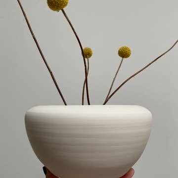 Is it a vase or a flower frog, or both? This little domed ceramic has ten holes to perfectly space your bouquet so you can create arrangements like a pro florist. Two types of clay are mixed on the wheel to create the brown and cream swirls, resulting a unique design for every piece. Use it for dried flowers, or fully submerge in a larger container to fill with water. Your buds will be kept fresh and fabulous. Each is about 3" in diameter, 1.5" high, handmade in San Diego CA.