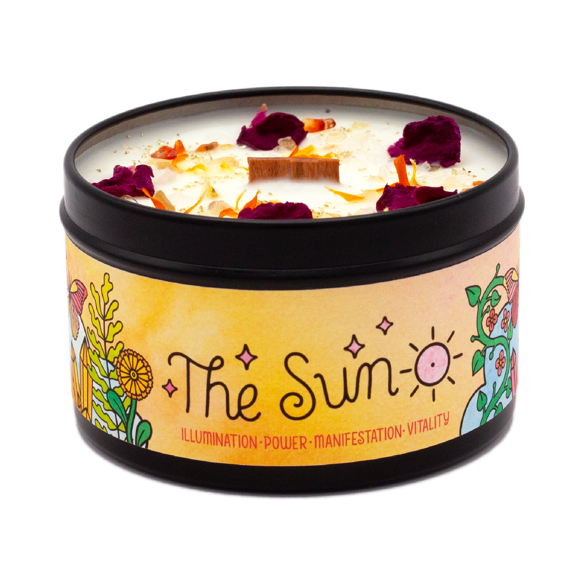 Made in United States Benefit: Energizing Burn Time: 30-35 hours Color: Gold and Multi-Colored Fragrance Family: Citrus Handmade: Yes Material: Metal Occasion Theme: Easter, Everyday, and Mother's Day Occasion: Birthday and Midsummer Scent: Citrus and Fruity Season: Spring and Summer Size: 6 oz Style: Bohemian Theme: Celestial and Zodiac & Birth Month Wax Type: Soy Product Language: English Ingredients: Contains: Soy Wax/Vegan. Fragrance Oil (Mandarin Orange, Citron, Sugar Cane). Charged Citrine, Amazonite and Quartz. Rose Bud. Hill Flower. 6 oz. 30-35 hour burning time. Hand-poured in Palm Springs, Ca. Weight: 170.1 g (6 oz) Product Materials: Plastic-free and Vegan Packaging: Plastic-free and Recyclable
