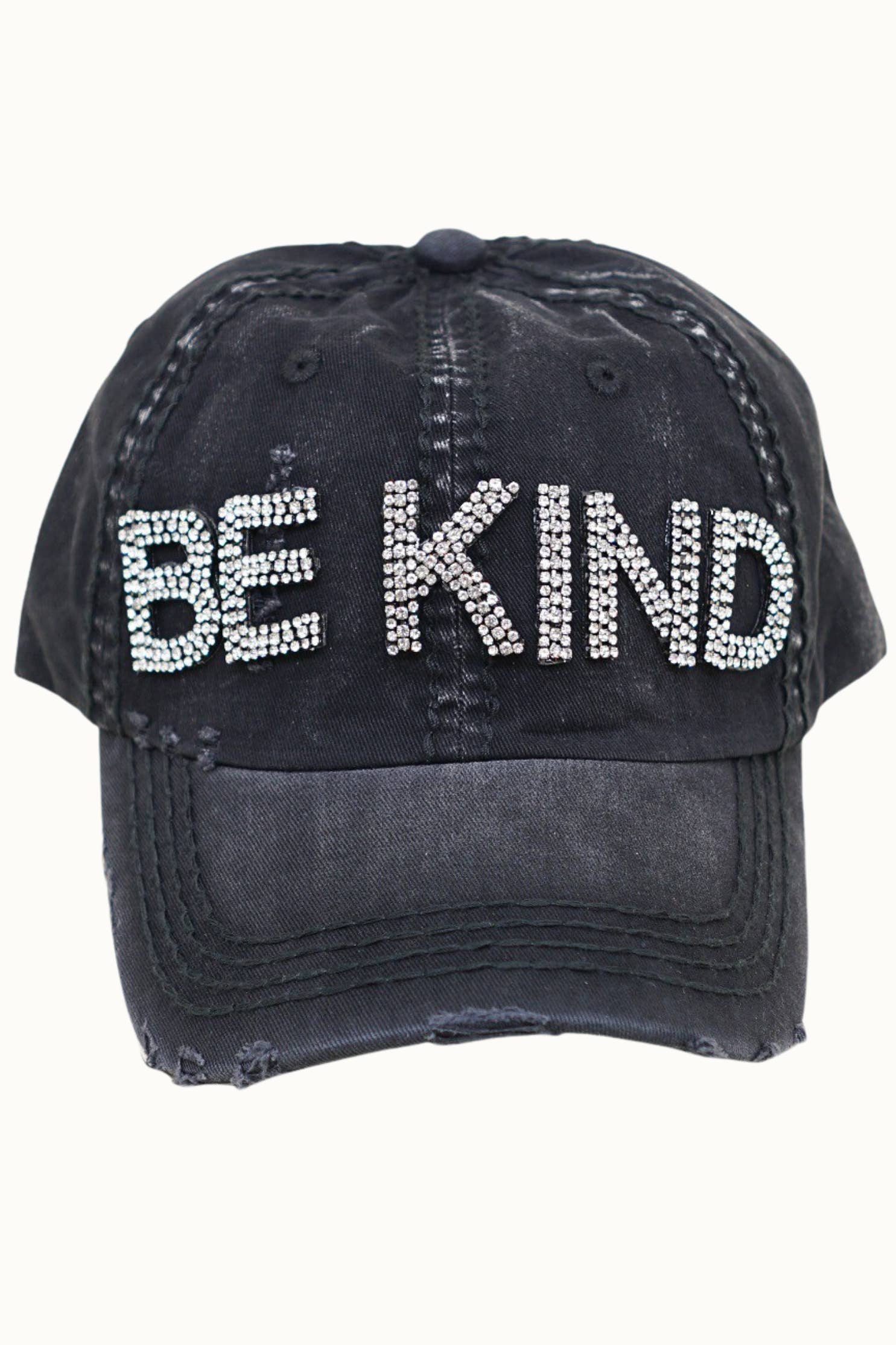 Black baseball hat White "Be Kind" embroidered on front 100% Cotton Adjustable closure Min. Qty. 2