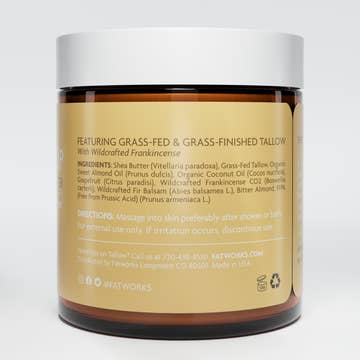Purified organic grass fed tallow sourced from small operation farms and rendered in optimal conditions to maintain nutrients. Complemented with the goodness of simple ingredients:organic unrefined coconut oil, organic virgin shea butter, organic beeswax. Perks of Tallow for skin care~ Being biologically closest to our own natural oils, high quality tallow is fully accepted by our skin allowing full absorption while not clogging pores (noncomedogenic). Nutrient rich, anti-inflammatory, nourishing, collagen boosting tallow is a superfood for your skin and is highly sought after by individuals who experience a wide variety of skin conditions.