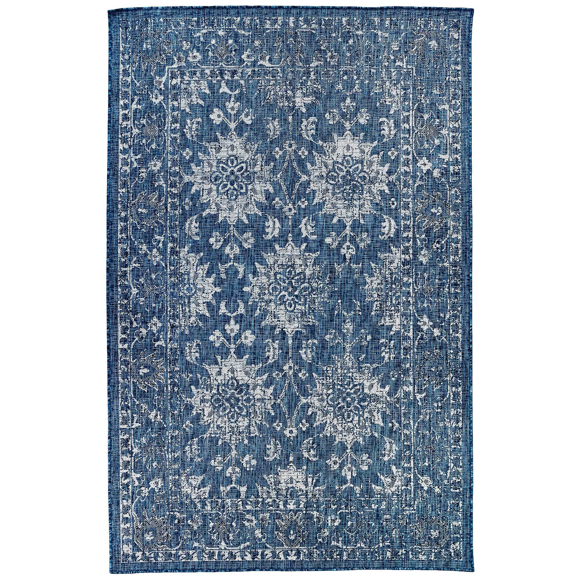 Set an inviting tone in your space with this 8-foot x 10-foot navy blue beige and taupe oriental washable indoor outdoor area rug. This rectangle shaped rug features a oriental design that will work well both indoors or out. A classic shape marries with good looking design for your living room, hall, bedroom, porch, patio, or poolside. Ideal for outdoor spaces or high traffic areas with kids and pets, this rug is made from heavy duty polyester that is stain resistant to help repel water, dirt, and stains. 96-inch h x 120-inch w x 0.19-inch d.A felt backing covers this rug to finish the look, keep the fibers in place, and help to keep the rug from slipping.Classically shaped, this versatile rectangular rug is a great way to accent your indoor or outdoor space.machine made outdoor rug with stain-resistant and non-slip backing for durability and safety.Machine woven rugs offer precise design and designer looks for a fraction of their handmade counterparts.