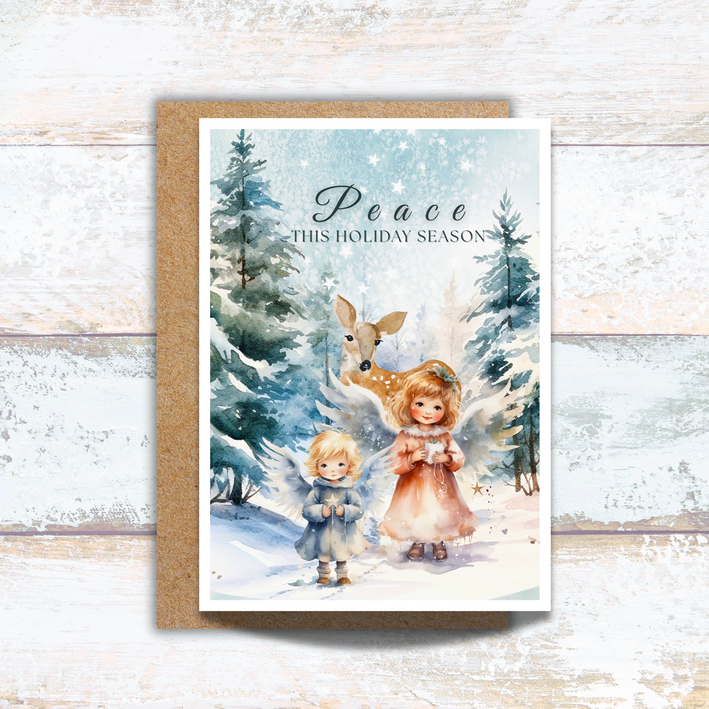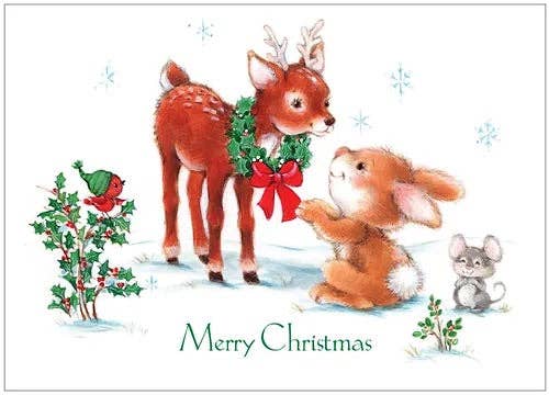 Celebrate the magic of the season with this enchanting Christmas Bunny by the Tree card. Featuring an adorable bunny dressed in a cozy winter outfit, decorating a sparkling Christmas tree with ornaments while warm candlelight glows around. The snowy night outside the window adds a touch of wonder to this heartwarming scene, perfect for spreading holiday joy to friends and family. The vintage-inspired style and whimsical details make this card an ideal choice for those who love woodland animals and festive decor. Whether used for holiday greetings or as a beautiful display piece, this card captures the charm and warmth of a magical Christmas. -Blank Inside white card with a matte finish -5x7 when folded includes a white envelope -Individually packaged in a sealed cellophane sleeve -Hand made in USA