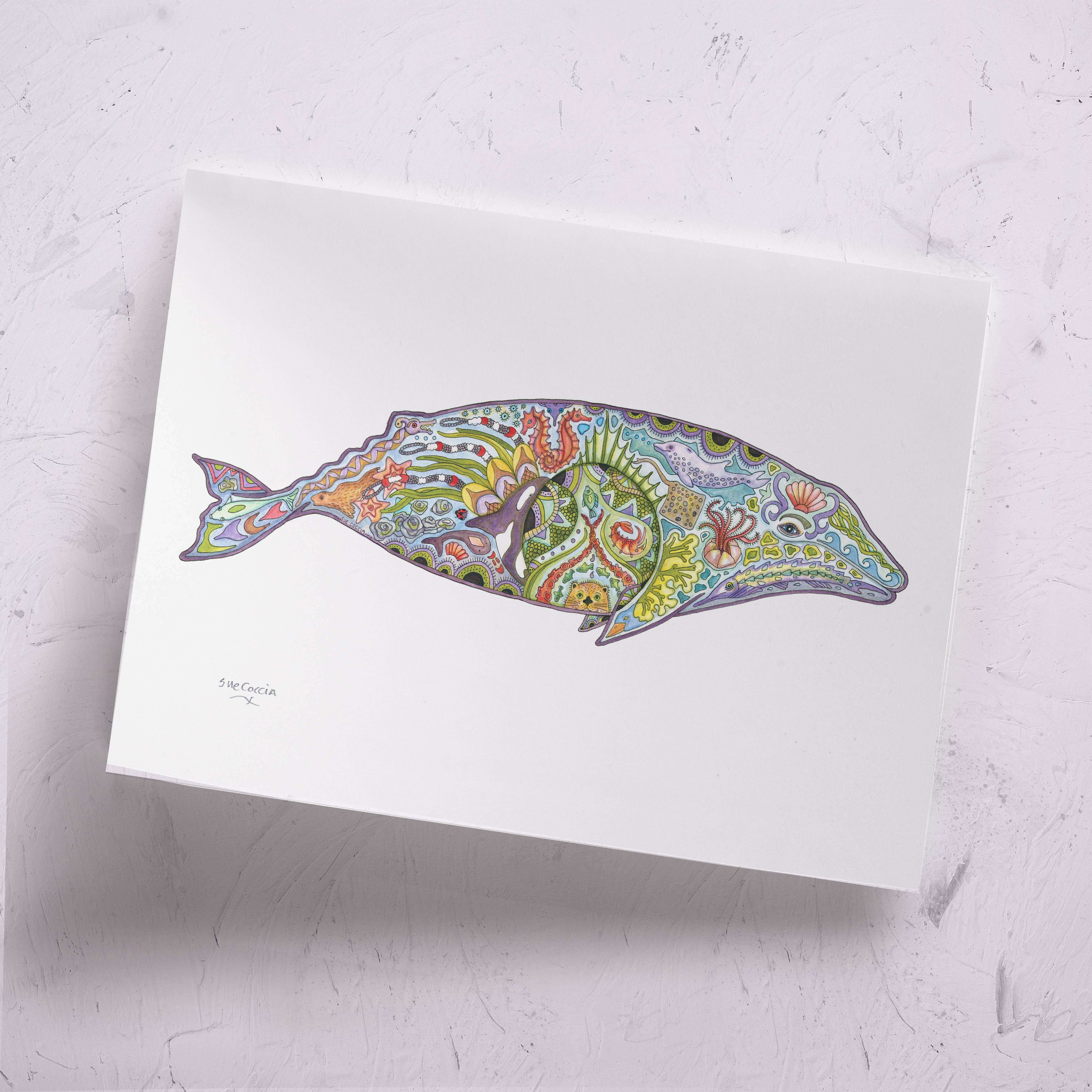 This whale poster is perfect for whale lovers, nautical decor or adorable nursery art. Featuring these cheerful and whimsical cetaceans: blue whale, sperm whale, humpback, beluga, minke, gray whale and dual narwhals with species name indicated. Printed on archival and luxurious watercolor paper. Each print is closely inspected by the artists who created it. Human made, never AI generated. Prints are 11" x 14" or 16" x 20", printed on archival and luxurious watercolor textured paper. Prints come packaged in clear cellophane bags and cardboard backing.