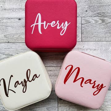 This Grandma Heart Faux leather travel jewelry box is a perfect mother's day gift, grandparent's day or a birthday gift for grandma. 4" X 4" Leatherette Travel Jewelry Boxes are compact for your suitcase or purse. Inside of box as compartments for chains, rings, earrings, or whatever jewelry you want to bring along. Have a custom design in mind? Let us know...we would love to work with you on a custom design just for your shop.