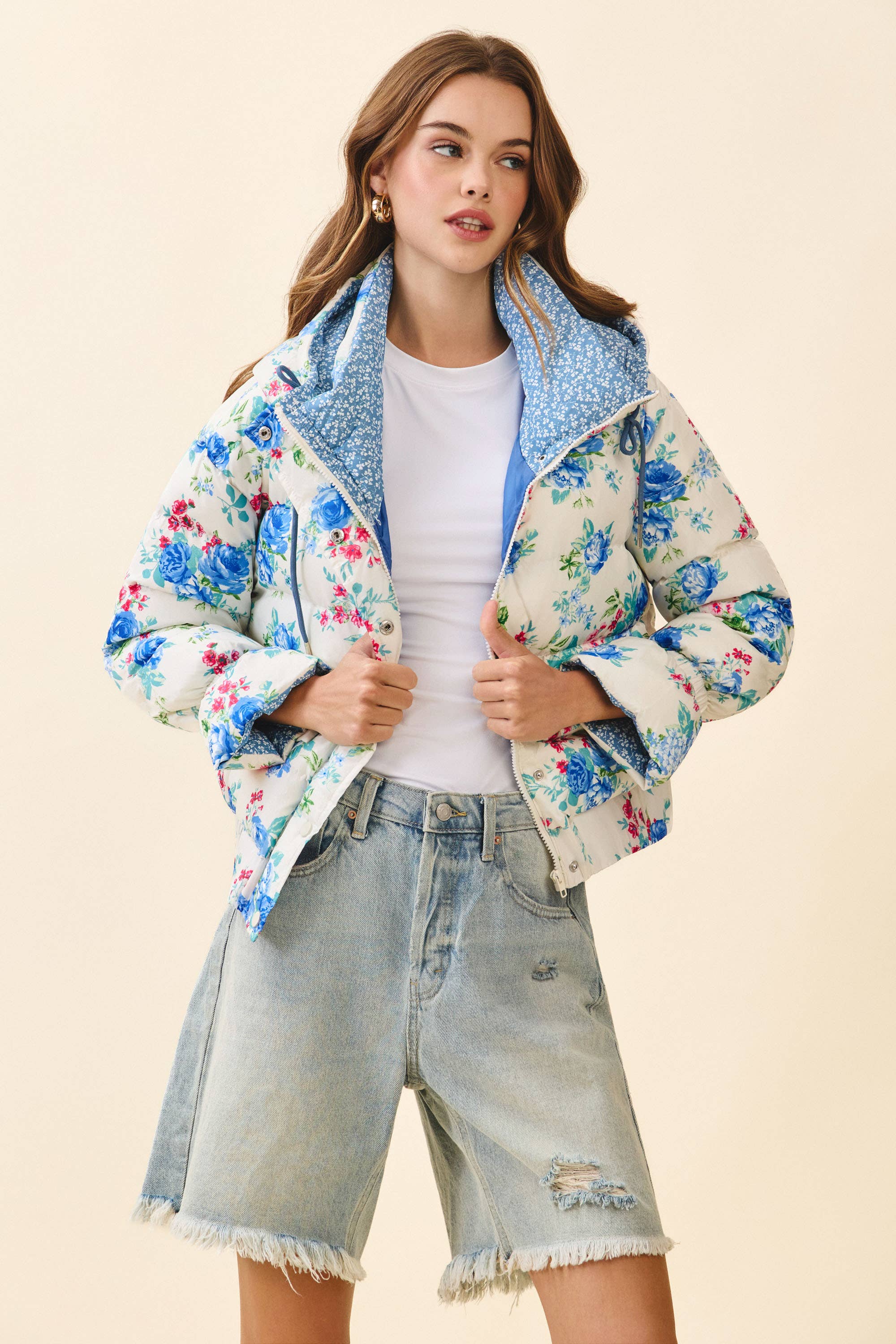 Floral puffer jacket with bow knot elbow string and a collared neckline. Zipper and button closure. Featuring side pockets. Model Size + Fit: Model height: 5'11" Dress size: Small Bust: 31.5 Waist: 23.5 Hips: 35
