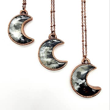 Tiny hand painted moons layered in polished, dimensional resin. Attached is a beautifully unique slice of amethyst + jasper. Each piece varies slightly. About 2" x 0.75" with an 18" antique silver chain.