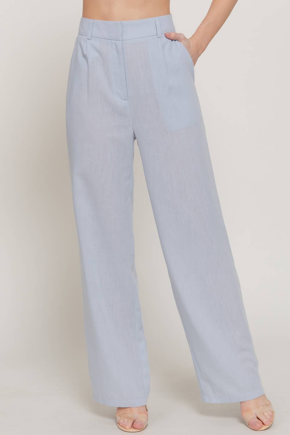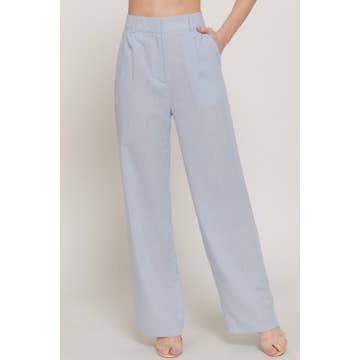 High-waisted fitted straight leg pant with button front closure. Available in Lapis Twill, Sage Twill, and Cloud Linen. Lapis Twill: 100% Cotton Sage Twill: 100% Cotton Cloud Linen: Shell - 100% Linen, Lining - 100% Cotton