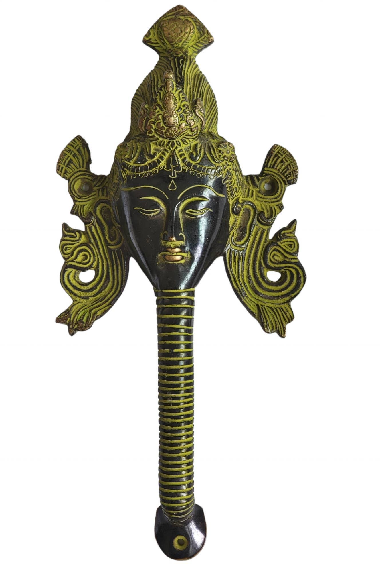 This unique decorative brass Mermaid door pull combines handmade craftsmanship with a hint of elegance inspired by nature and local Balinese mythology, making it the ideal addition to any door, closet, wardrobe, cabinet of the house. By carefully handcrafting each Mermaid door pull, talented local artisans from Indonesia ensure that each one is of the highest caliber and has a distinct personality. It is constructed with recycled copper and zinc from Indonesia. We provide finishes in gold, antique (brown gold), silver Dimensions: 13.5" x 3.5" x 2.5" Screw holes for installation distance 11.25" one on the top and one on the bottom. Instructions: The door pull features 2 holes one in each side of the pull, making the process simple. You will need to drill a hole in the surface where you plan to apply it. * IMPORTANT!!! If the items are out stock in USA and have to be shipped from Bali they will have an extra shipping cost.
