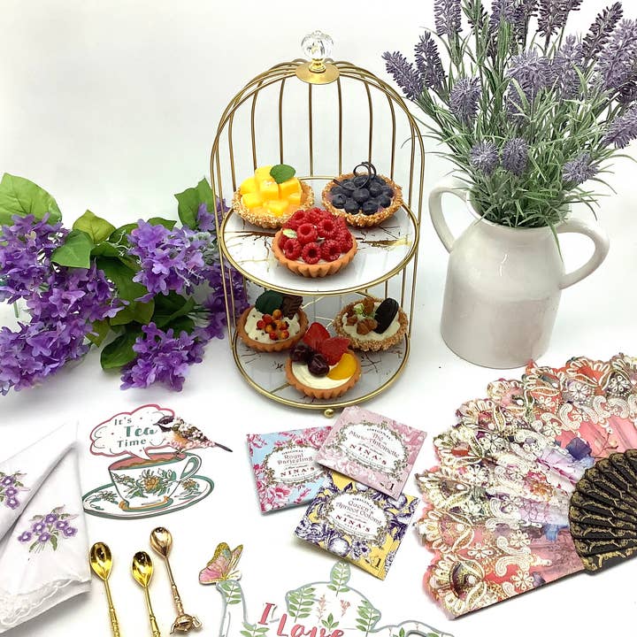 This serving stand consists of two shelves in a metal golden bird cage Props are not included (napkins, spoons, teas, decor, etc) This item is successfully sold in our gift shop and online at the MSRP; it is also carried and sold in over 100 Merchants throughout USA and International Market. MSRP is a suggestion. Retailer is responsible for understating their Customer base, their pricing strategy, and taking into consideration their full wrap rate for profit. How item is displayed, presented and sold to end Customer is Retailer’s responsibility.